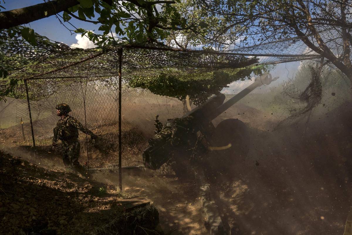 Ukrajinští dělostřelci odpalují granát ráže 122mm z houfnice D030 na ruské pozice na donbaské frontě.