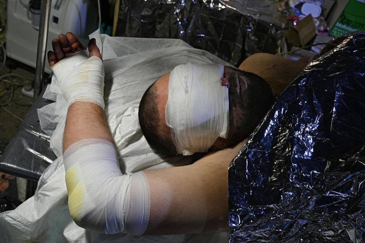 Těžce zraněný ukrajinský voják Jevhen v polní ošetřovně u Avdijivky.