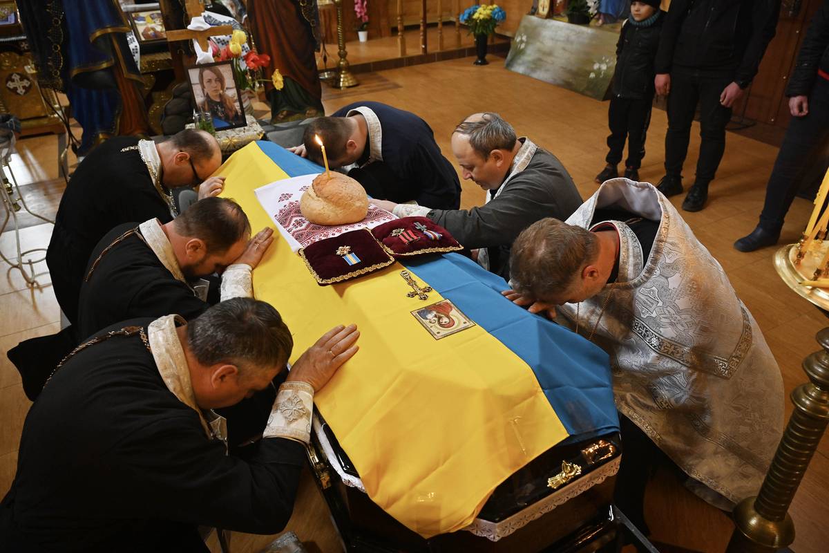 Rakev Kateryny Šynkarenko během obřadu v Chrámu svatého Mykoly Pravoslavné církve Ukrajiny v Ostrohu v Rovenské oblasti