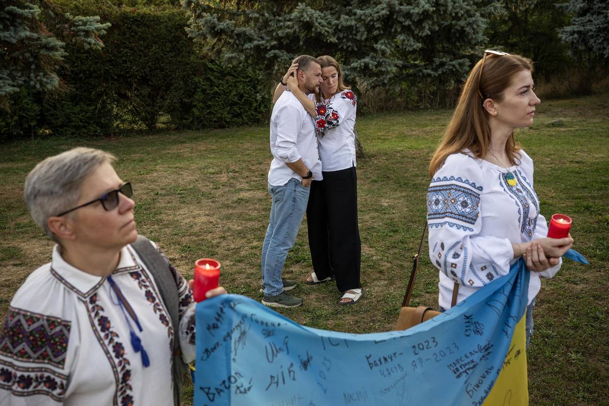 Ukrajinci, slavnostně odění v národních krojích (vyšivankách), si připomínají Den nezávislosti Ukrajiny 24. srpna 2024 na vojenském hřbitově v Užhorodu v Zakrapatské oblasti.
