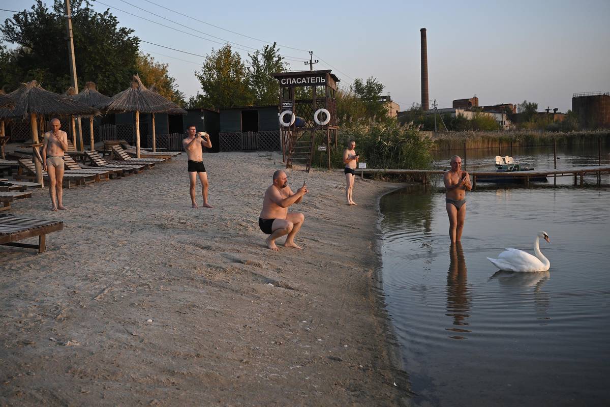 Muži, kteří budují protitanková opevnění, během chvíle odpočinku u donbaských slaných jezer.