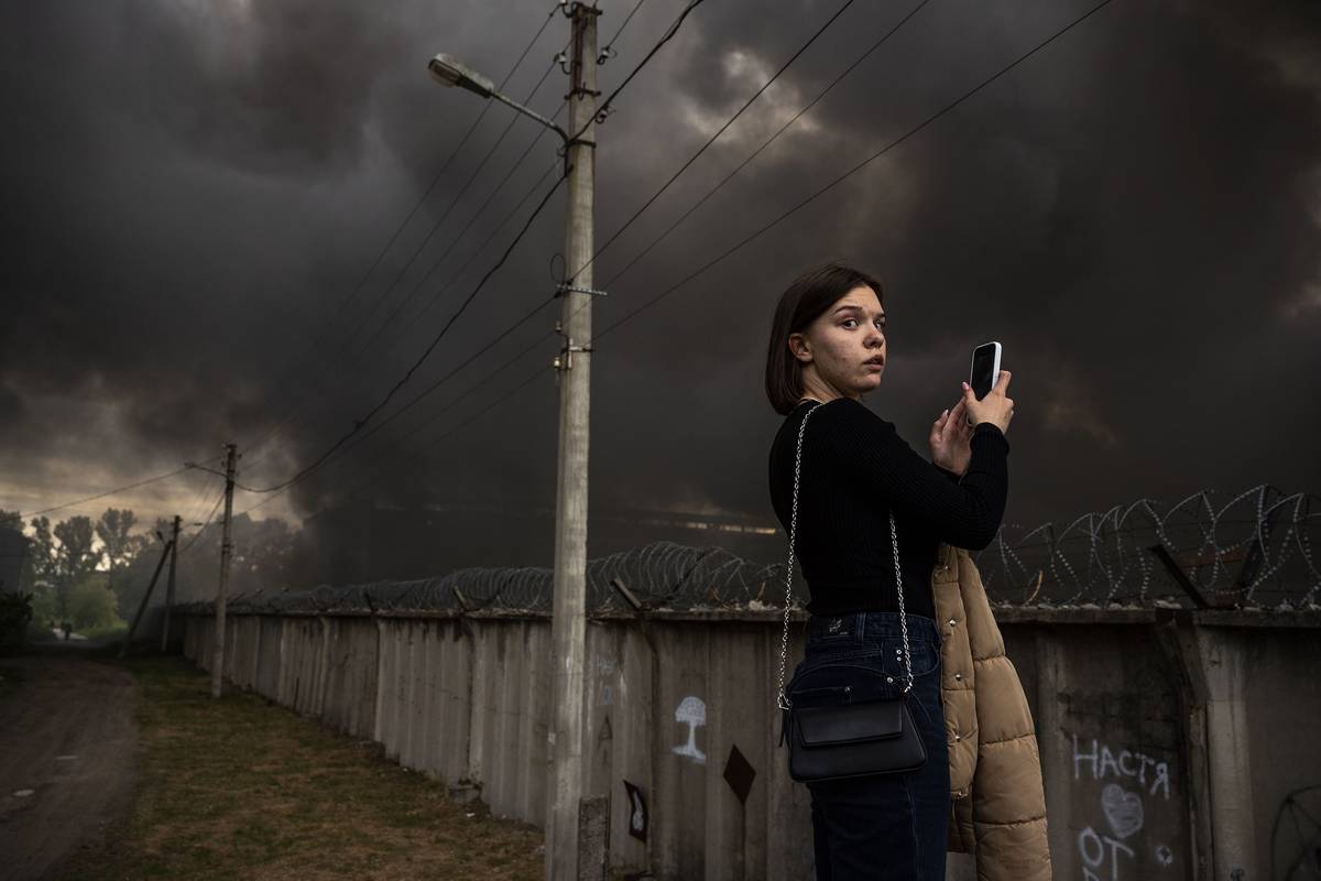 Sedmnáctiletá ukrajinská studentka Káťa s hrůzou pozoruje kouř valící se z fabriky, kterou právě vybombardovala ruská armáda.