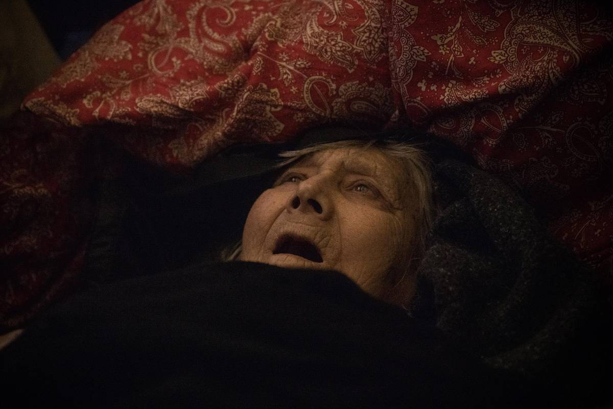 Vyděšená babička Valja na podlaze rozhrkané dodávky, která ji odváží z jejího domu ve Vovčansku kamsi do uprchlického centra v Charkově.