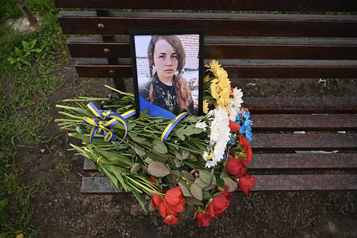 Portrét a pohřební kytice u hrobu ukrajinské snajperky Kateryny Šynkarenko, která padla 22.února 2024 u Avdijivky.