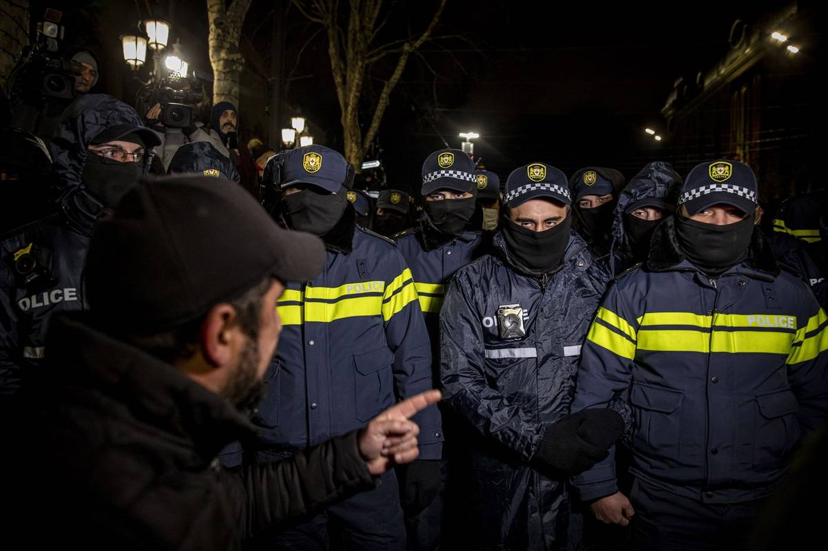 Demonstrující diskutuje s policisty na třídě Rustaveli v Tbilisi (Gruzie, 13.prosince 2024).