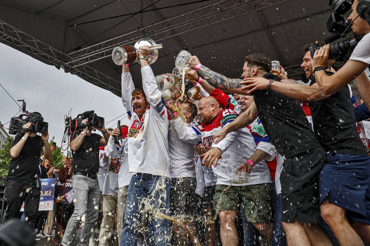Česká hokejová reprezentace slaví titul mistrů světa na Staroměstském náměstí (Praha, 27. května 2024).
