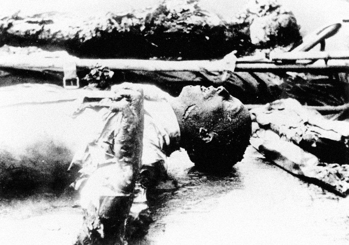 Obrana města se opírala o barikády v ulicích, průchody mezi domy a také o položené miny. Na snímku mrtvý civilista v Berlíně.