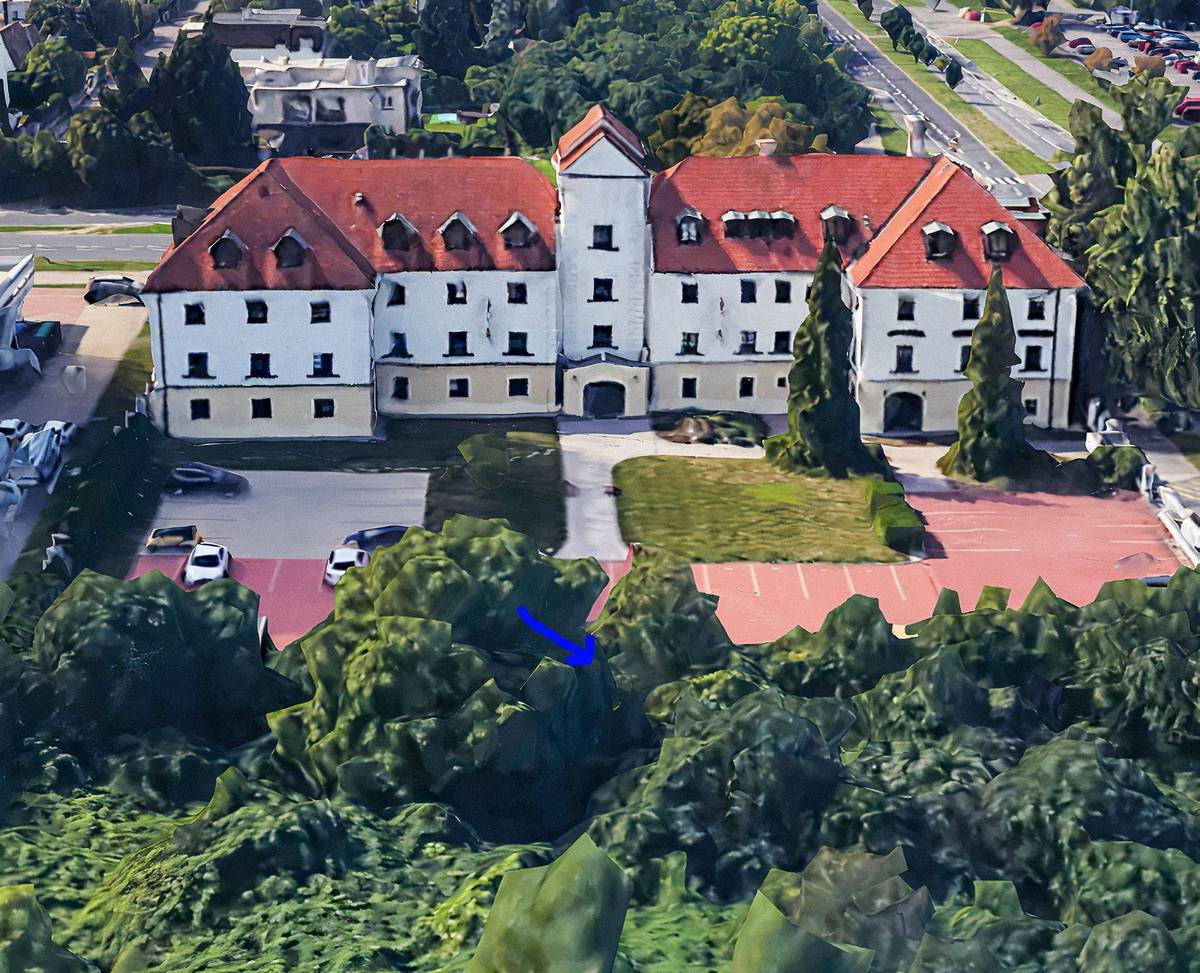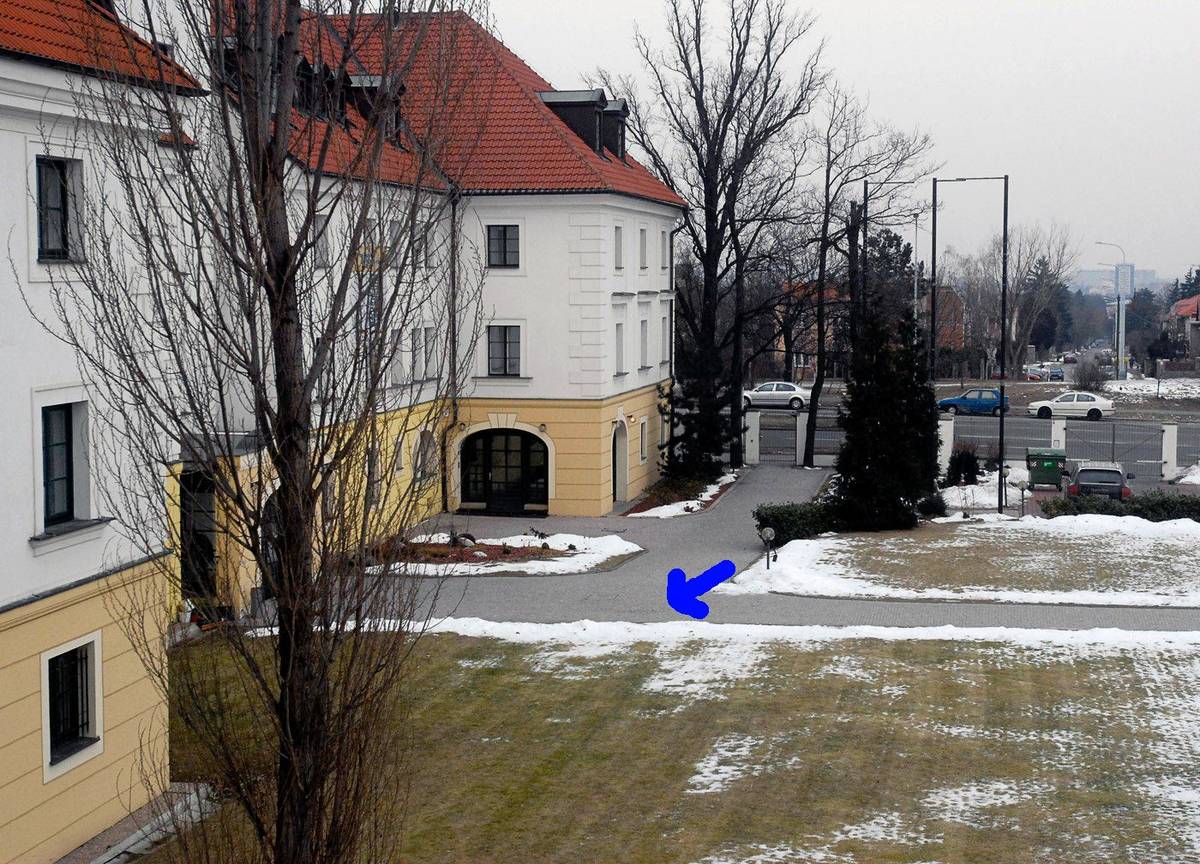 Pohled na historický objekt "Zámeček" v Durychově ulici. Šipka označuje možnou pozici nájemného odstřelovače, který zavraždil Františka Mrázka.