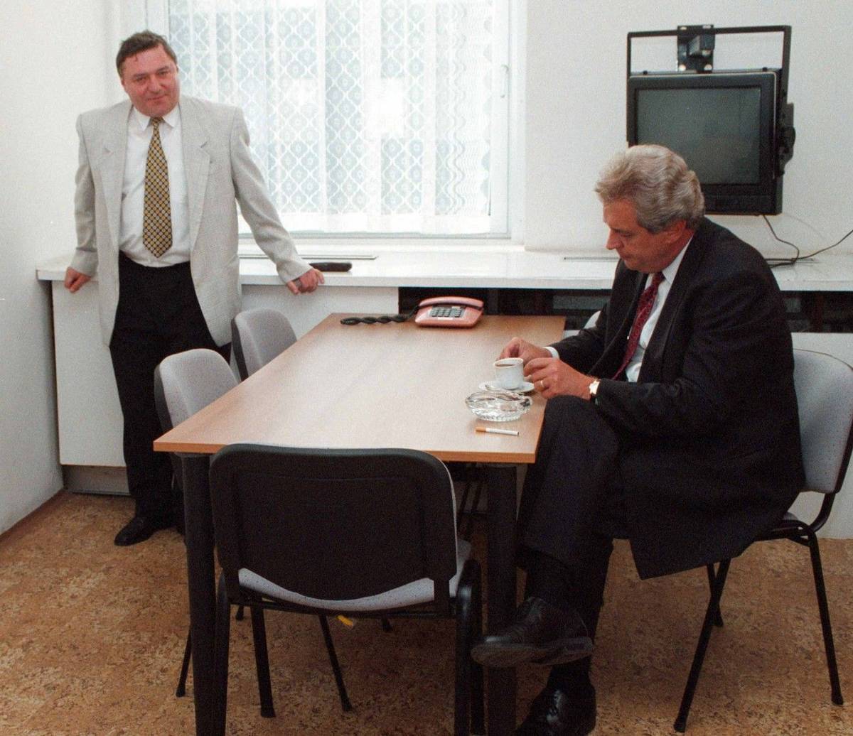 Snímek z června 1998 zobrazuje Miroslava Šloufa a tehdejšího předsedu ČSSD Miloše Zemana během čekání před zahájením diskusního pořadu Aréna v ČT.