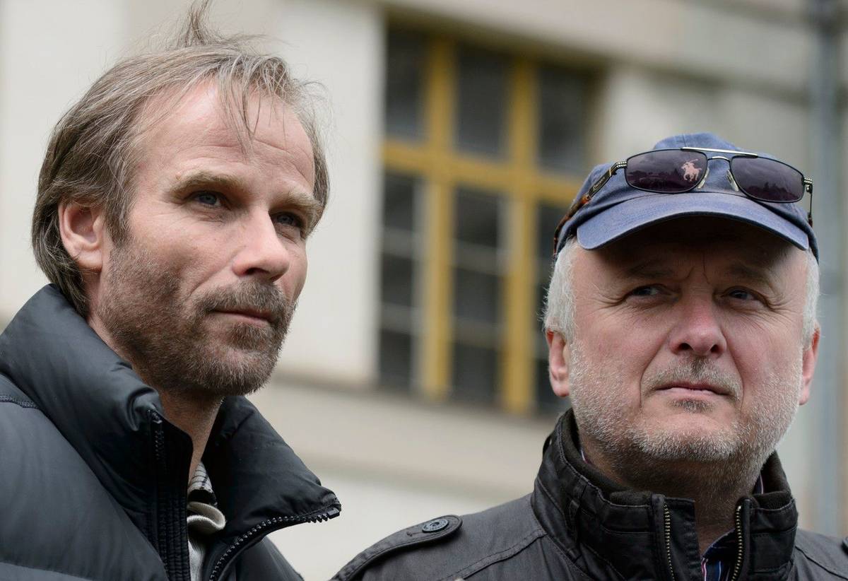 Bývalý policista Karel Tichý a herec Lukáš Vaculík během natáčení filmu Příběh kmotra 24. května 2013 v Kladně. Film režíroval Petr Nikolaev.
