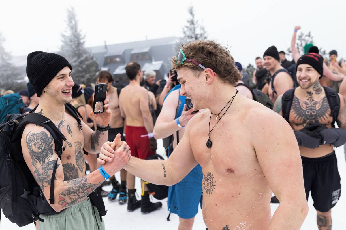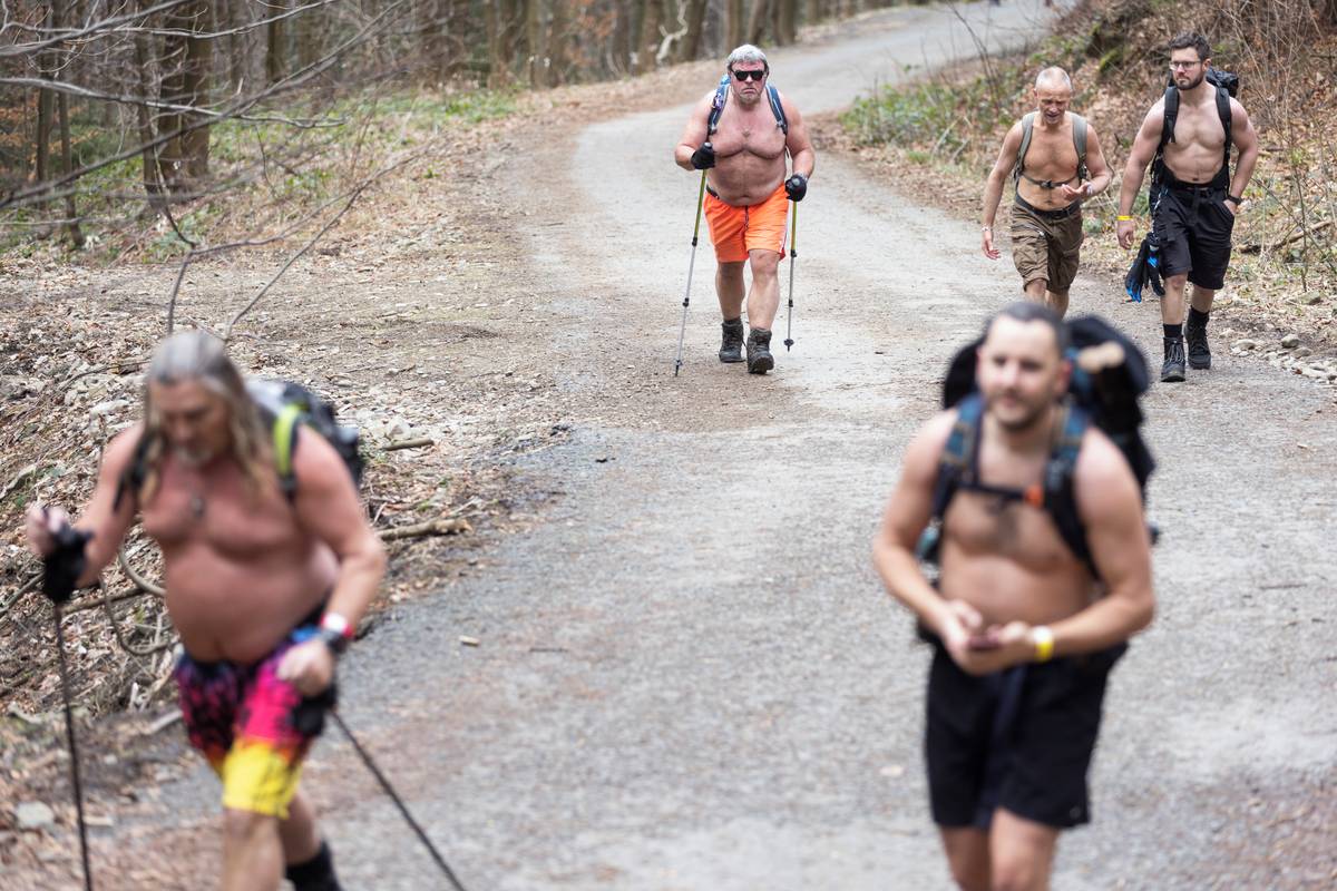 Mezi skupinou polonahých lidí v mé bundě úplně svítím. Otužilci mě hecují, abych to zkusil s nimi. V jejich docela rychlému tempu jim pak musím dát za pravdu a sundat aspoň mikinu.