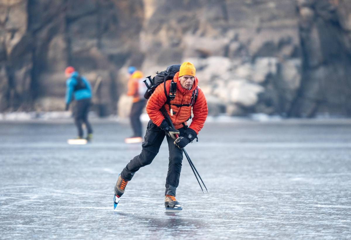 Na vodní nádrž Orlík vyrazili bruslaři už brzy ráno, jakmile se rozednilo, aby využili mrazivých nočních teplot, které led zpevnily.