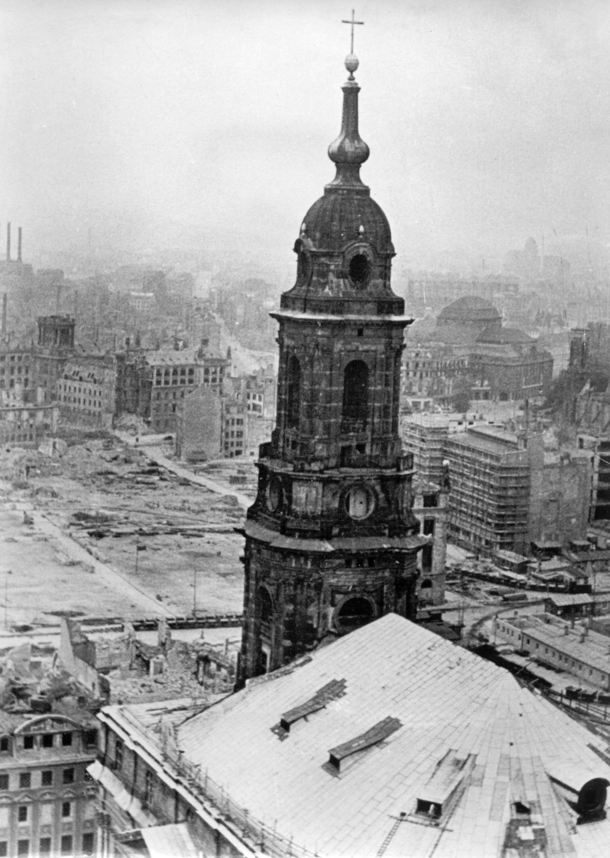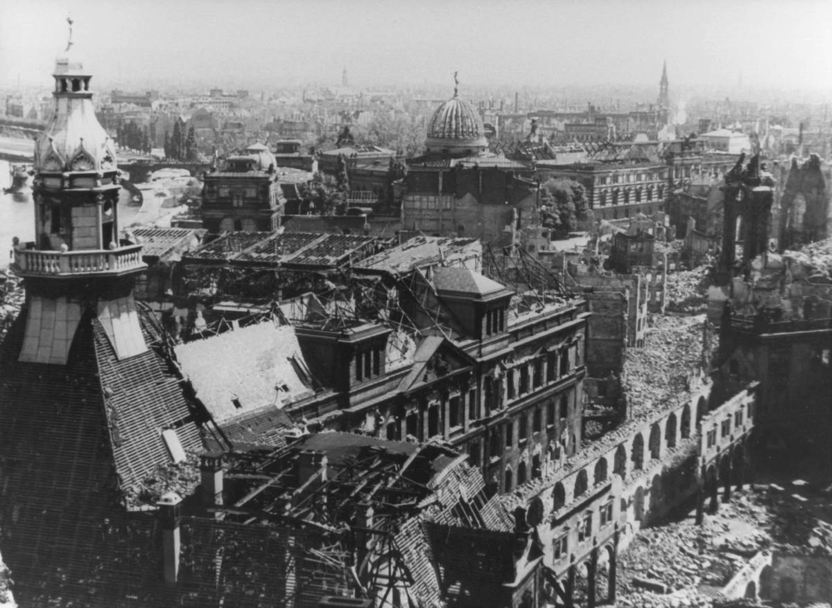 Pohled z věže radnice na zničené Drážďany v únoru 1945