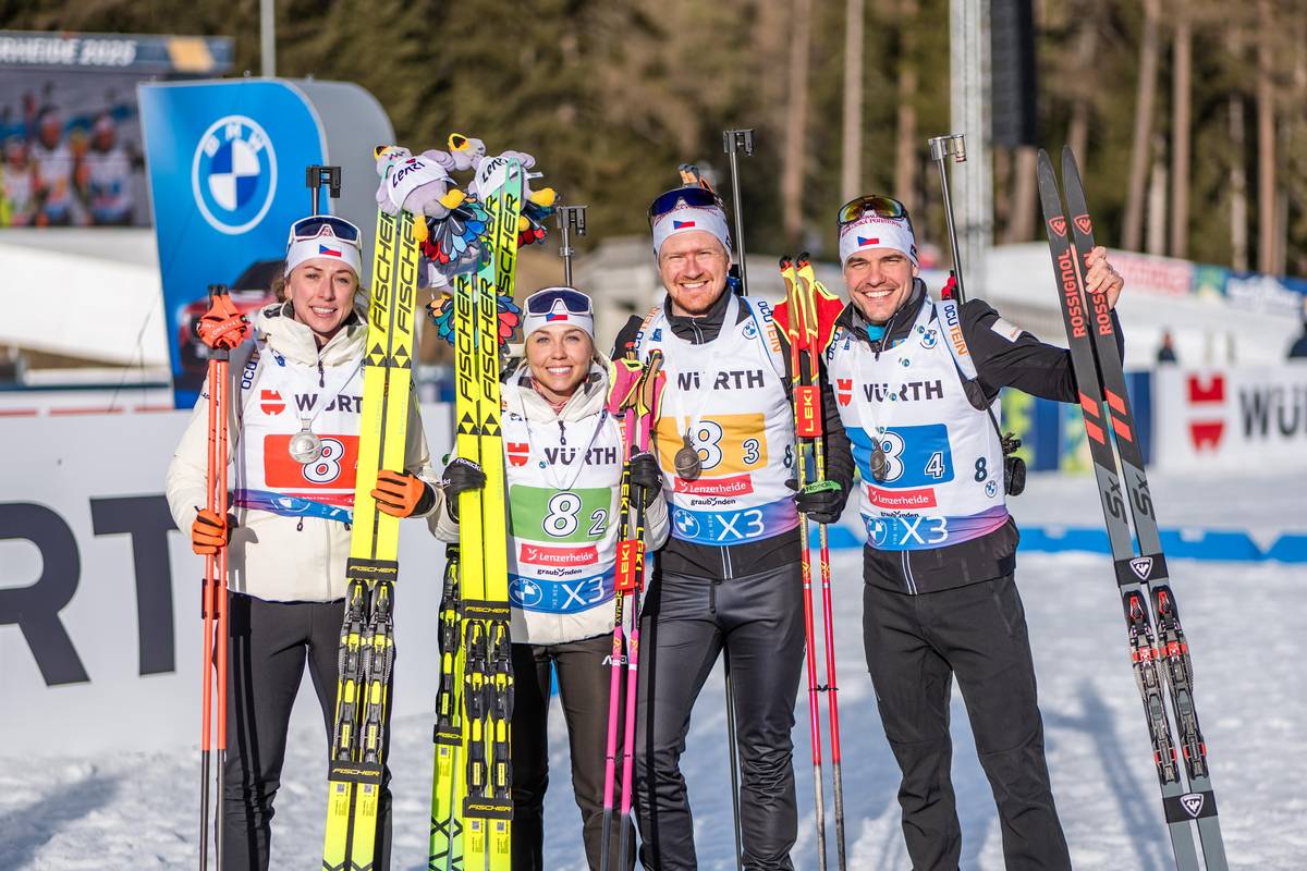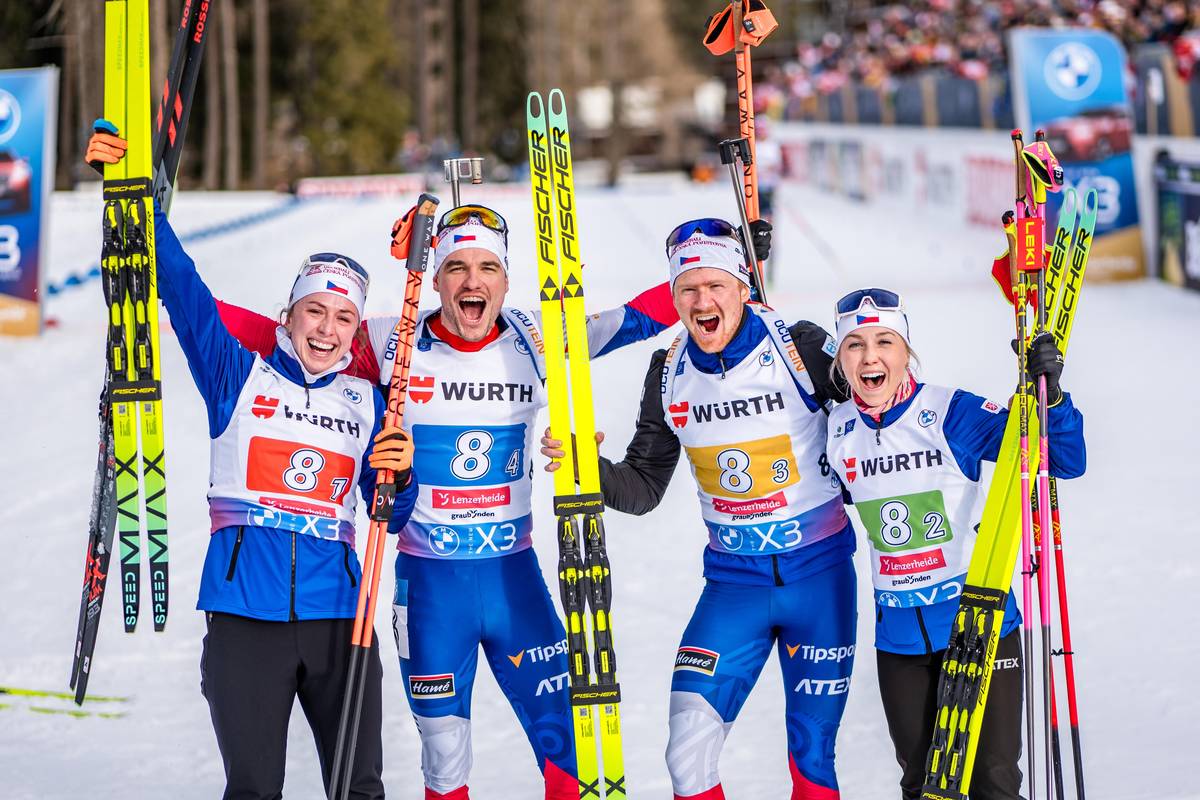 Čtveřice českých biatlonistů se raduje z druhého místa ve smíšené štafetě.