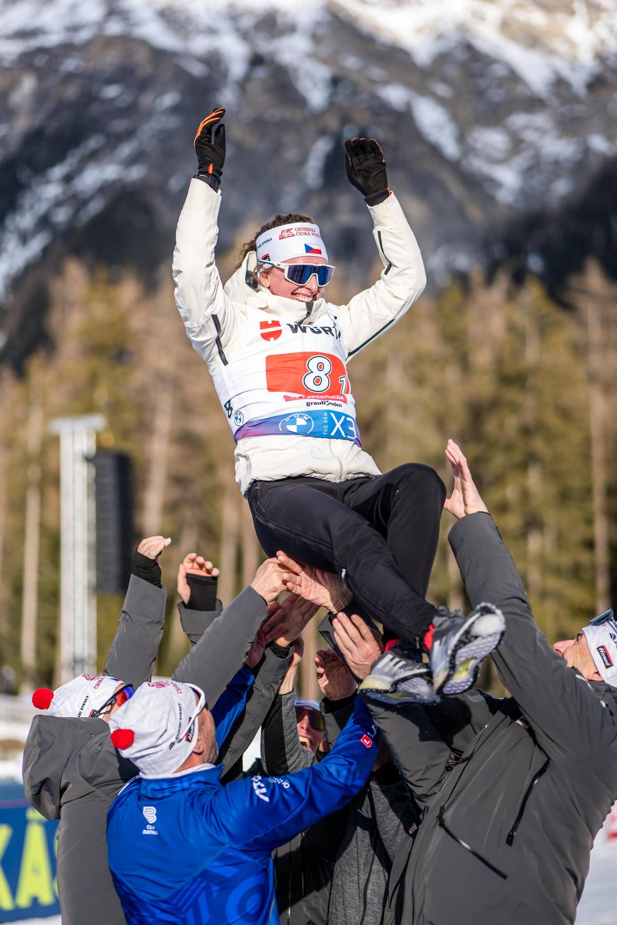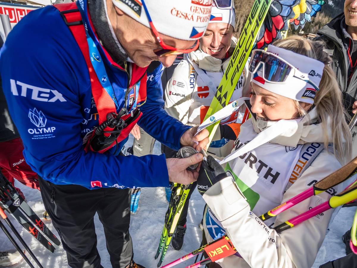 Biatlonistka Jessica Jislová si užívala oslav v cíli smíšené štafety.