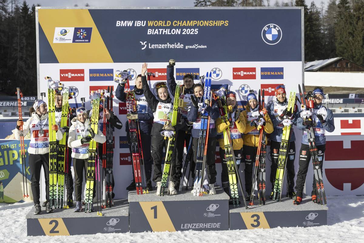 Čeští biatlonisté (vlevo) na stupních vítězů po smíšené štafetě