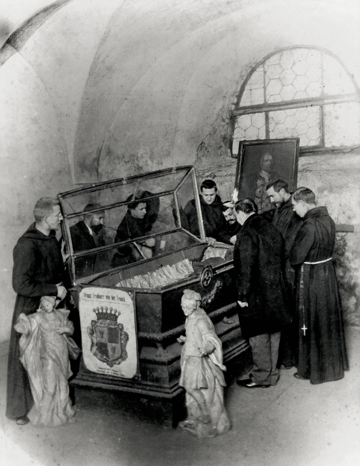 Mumie barona Trencka budí značný zájem. Na snímku návštěvníci hrobky na počátku 20. století. Kapucínská krypta, Brno