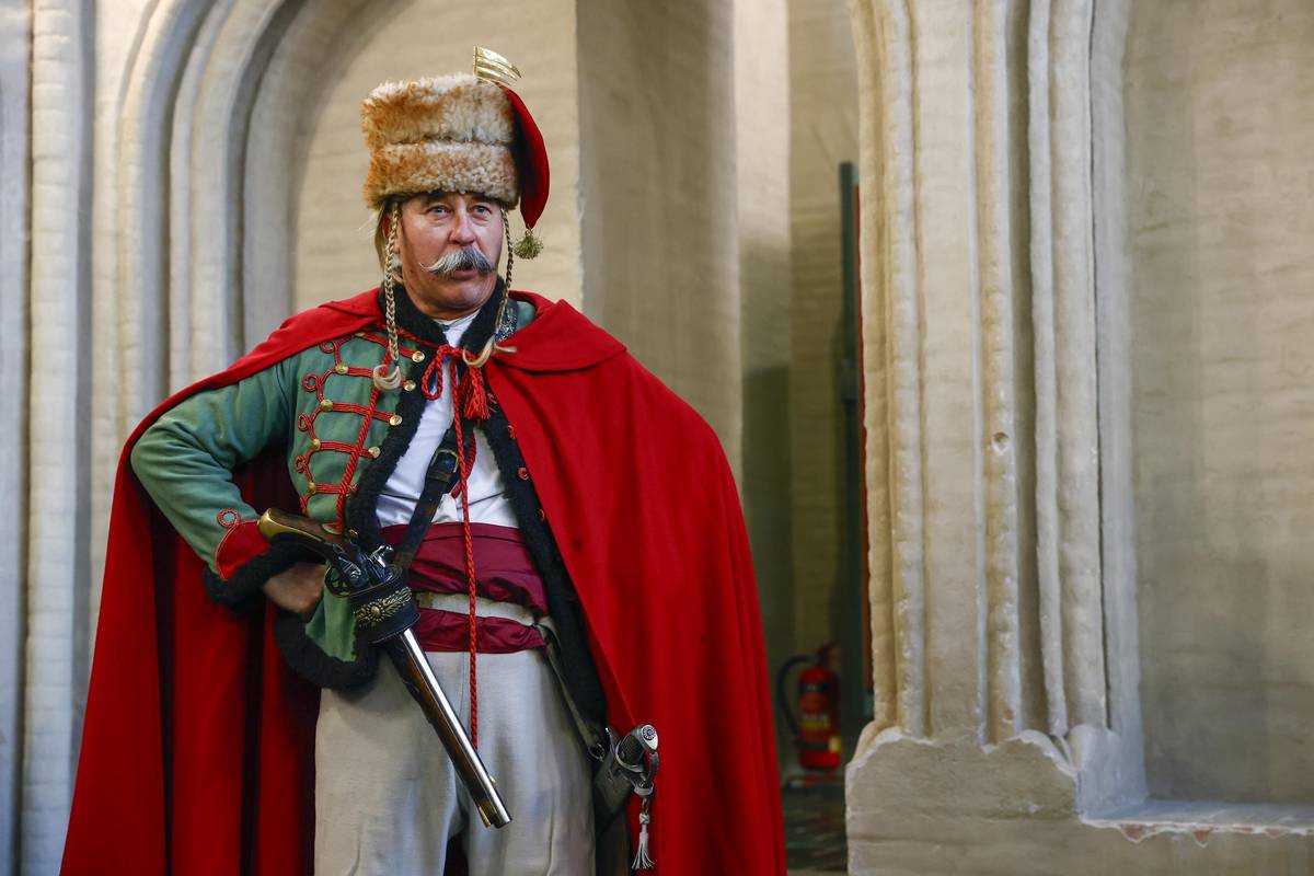 Spisovatel František Niedl v brněnské kapli, v pozadí portrét obávaného válečníka
