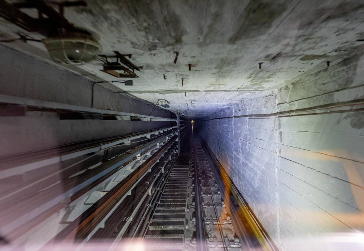 Pohled do výtahové šachty. Je dlouhá 200 metrů a vede do hloubky 160 metrů pod okolním terénem.