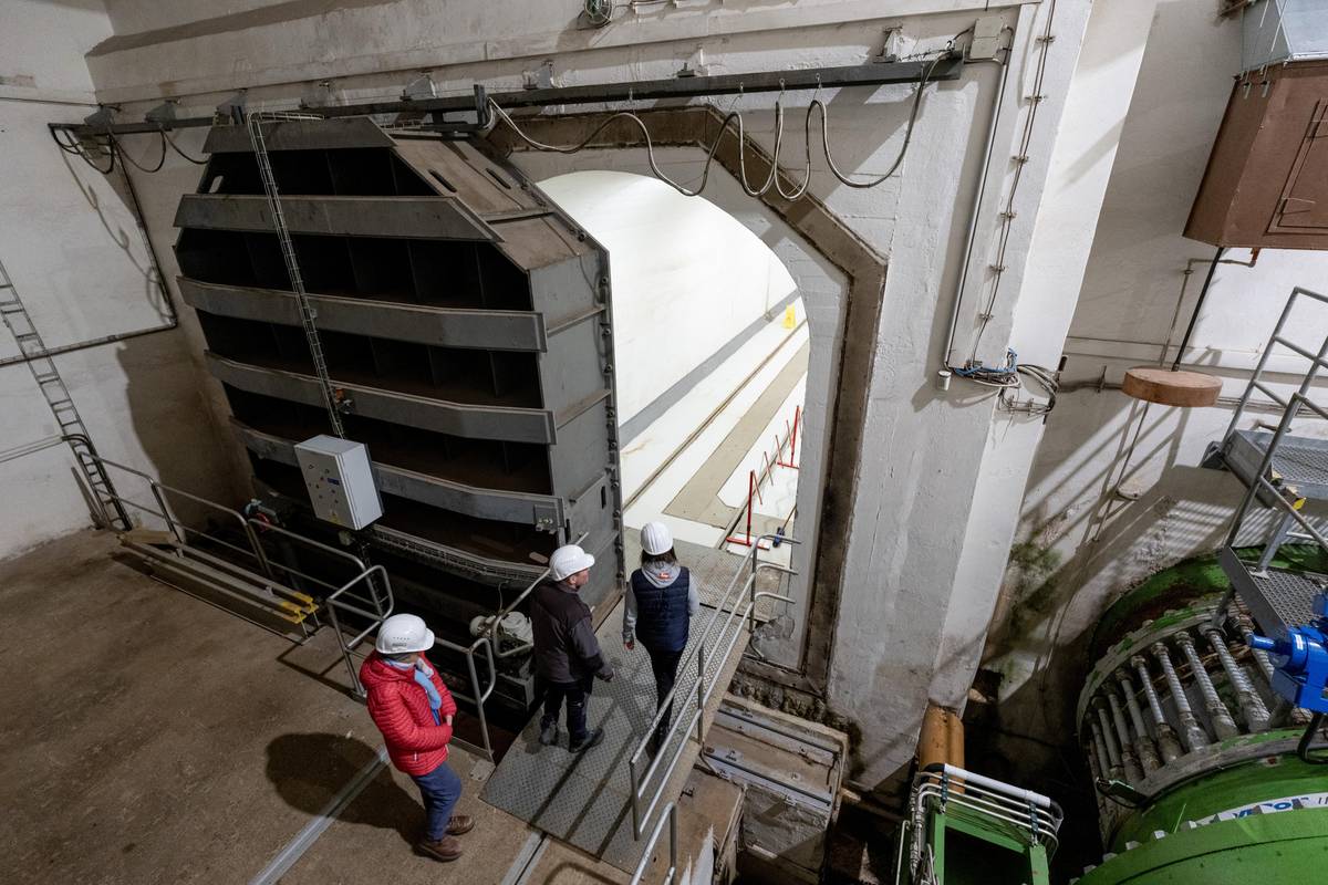 Bezpečnostní vrata sálu s kulovými uzávěry určené například k ochraně před povodní. Naštěstí nemusela být nikdy použita.