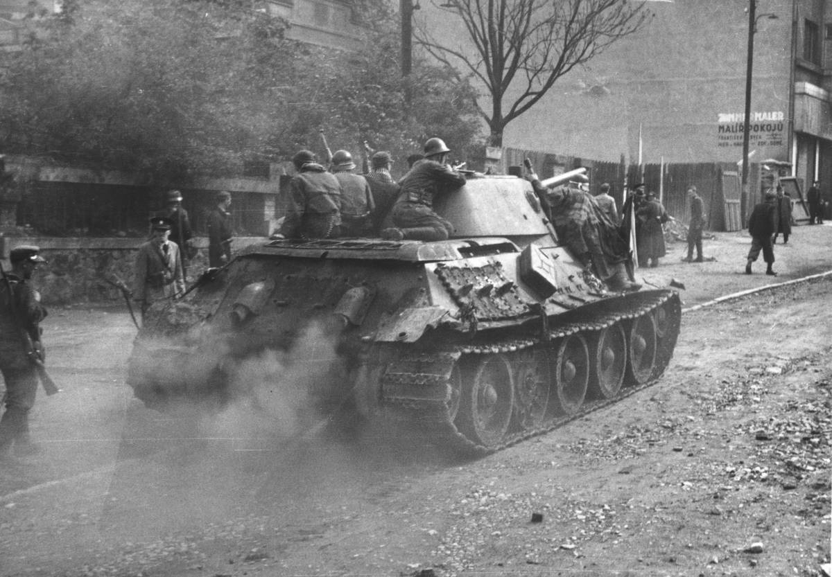 Pankrác 7. května 1945. Střední tank T-34/76 tankového praporu samostatného průzkumného oddílu ROA s pěším doprovodem českých povstalců vjíždějící do Lomnického ulice směr Soudní náměstí (dnes Náměstí hrdinů).