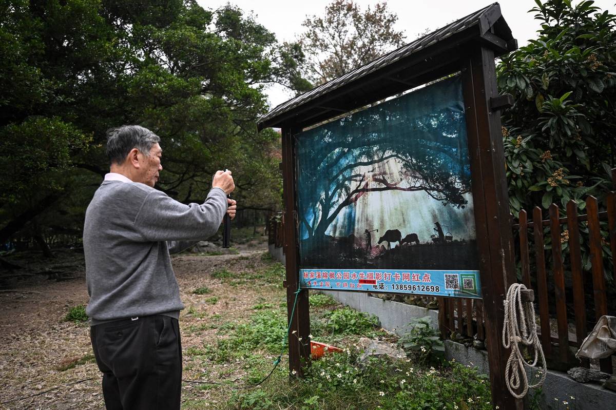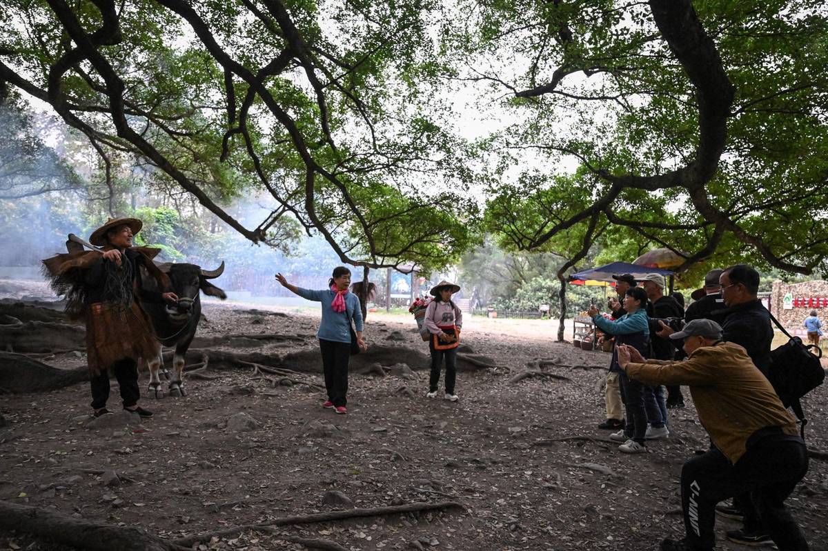 Když do vesnice začaly přijíždět větší skupiny, dovezl si farmář Čchen Wej-čuo vlastní skot z Vietnamu, jelikož v Číně už buvoly nikdo neprodává. Zatímco jeho zákazníci si libují v nabízené podívané, on je rád, že se zbavil své dřívější práce na poli. (Čchen pózuje turistům se svým buvolem v Sia-pchu ve východočínské provincii Fu-ťien, 11. prosince 2024.)
