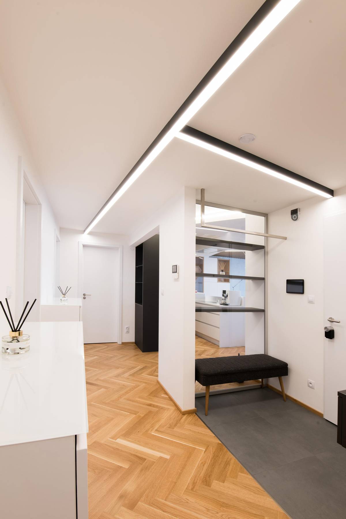 Vstupní chodba byla úzká a tmavá, zvětšilo a provzdušnilo ji odstranění příčky a propojení s obytným prostorem, originální osvětlení a skleněné plochy