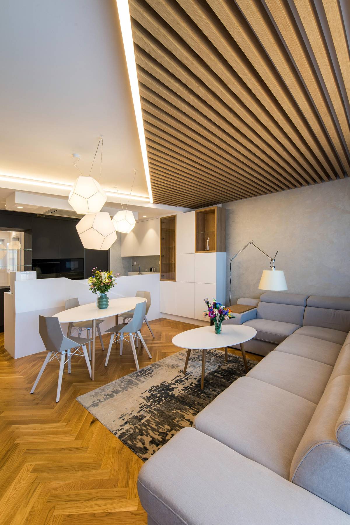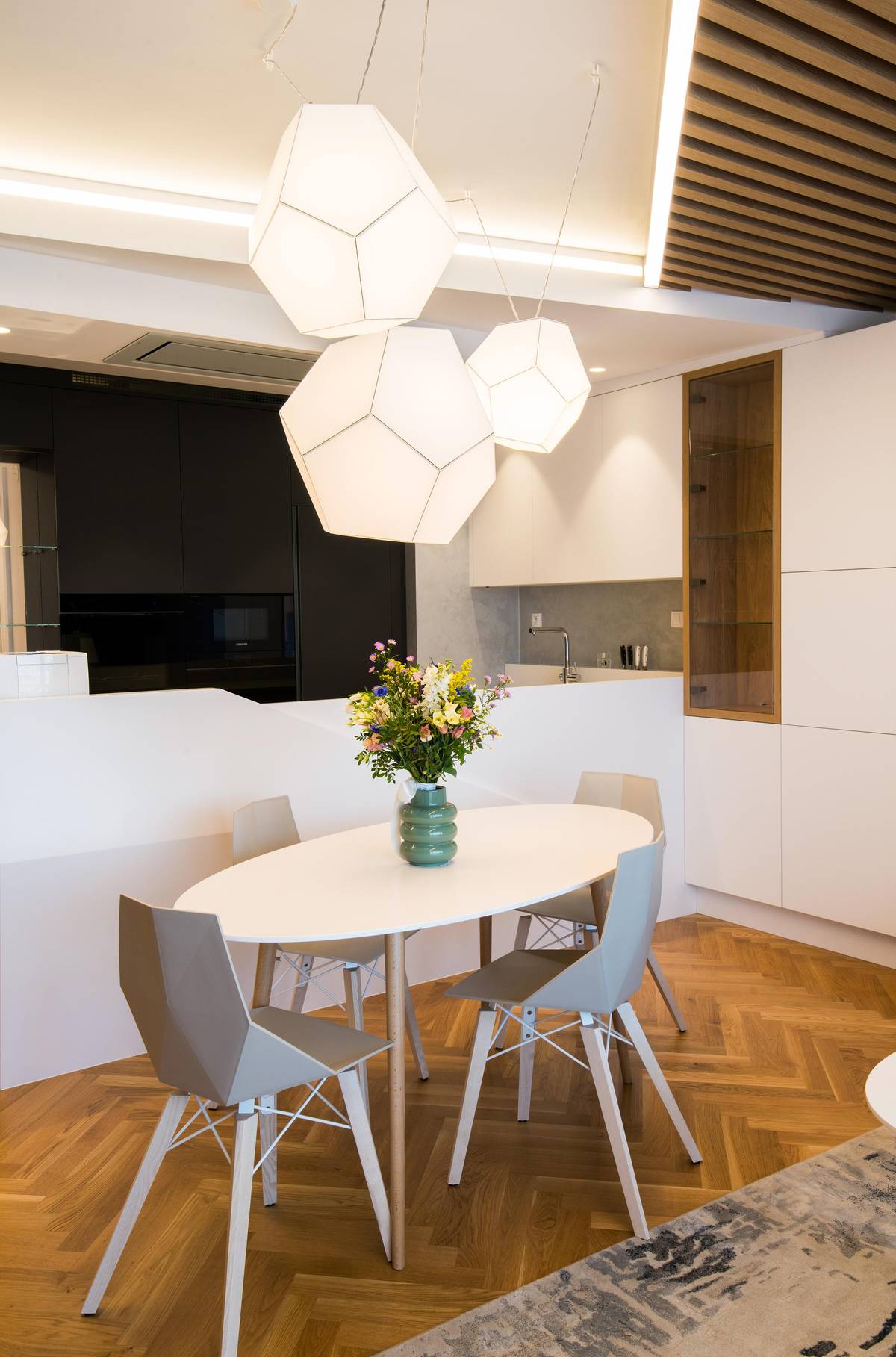 Strohý pravoúhlý půdorys oživili diagonální křivkou ve stropním podhledu a také pomocí další diagonály ve formě svítící LED linky v antracitové barvě