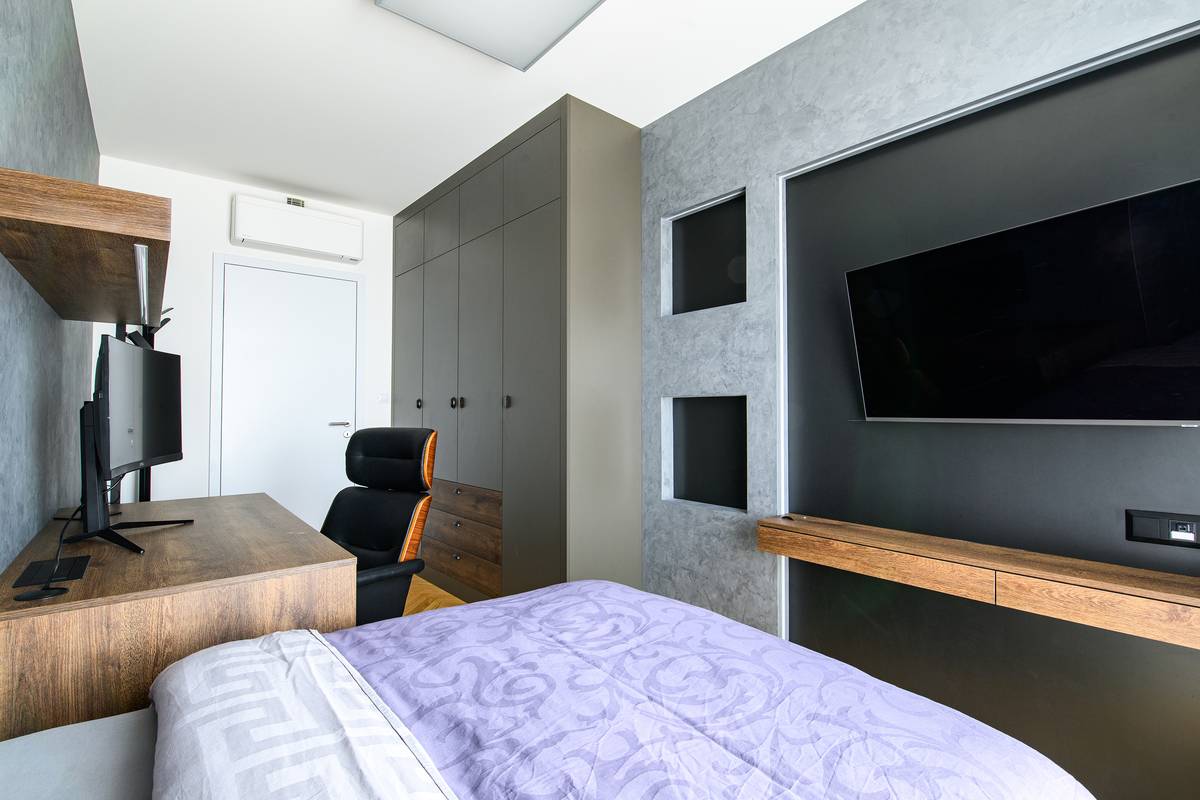 Patnáctiletý syn si přál pokoj s výraznými dřevěnými prvky a LED osvětlením na různých plochách