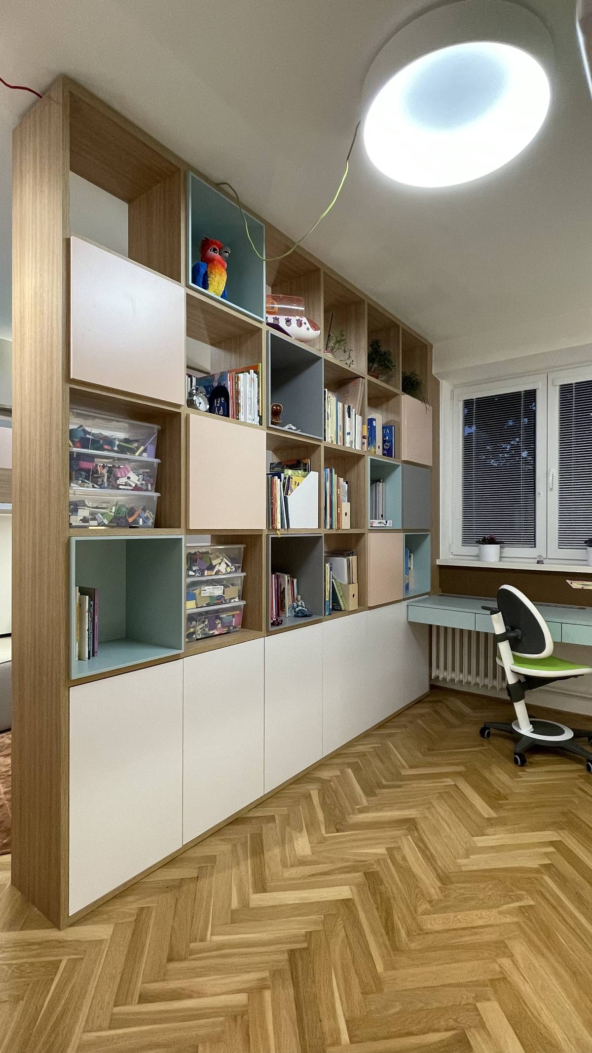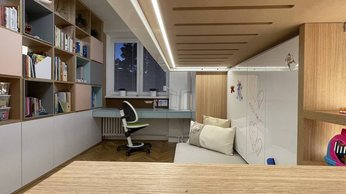 Šatní skříň navazuje na vyvýšené lůžko a pracovní stůl.