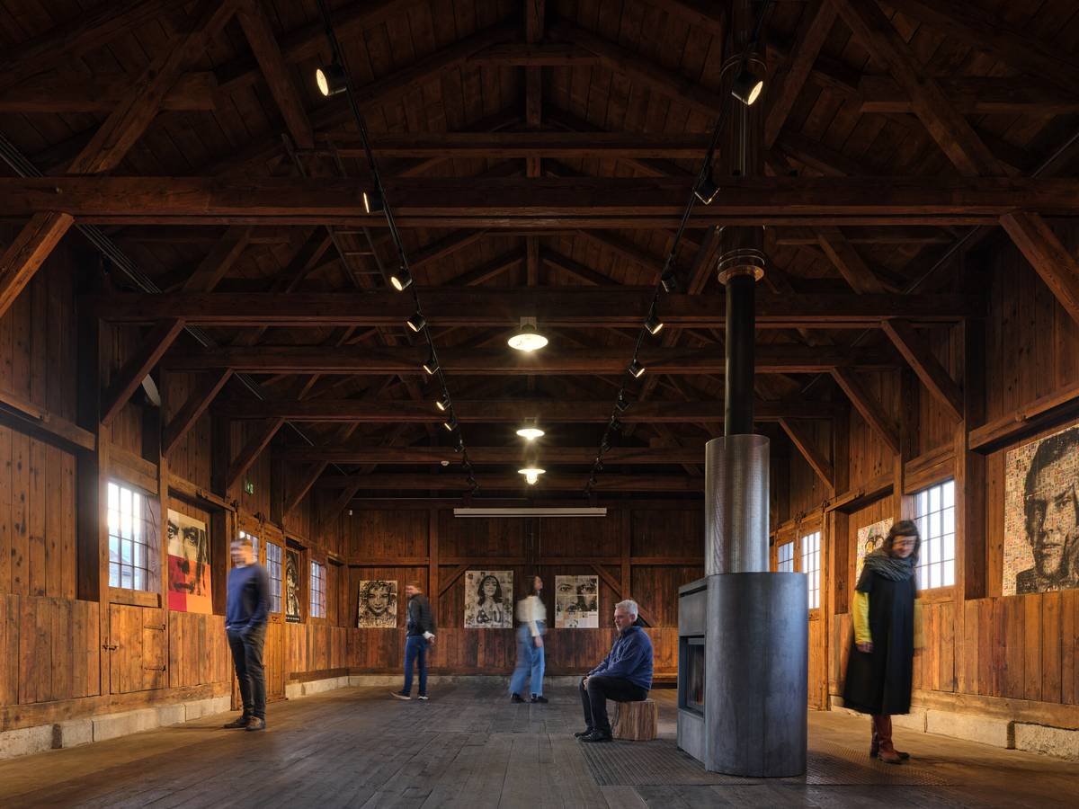 Místo jako stvořené pro pořádání kulturních akcí. Prostoru kromě vystavovaných děl dominuje krb, který je opláštěný ocelovým plechem se zaoblenými hranami.
