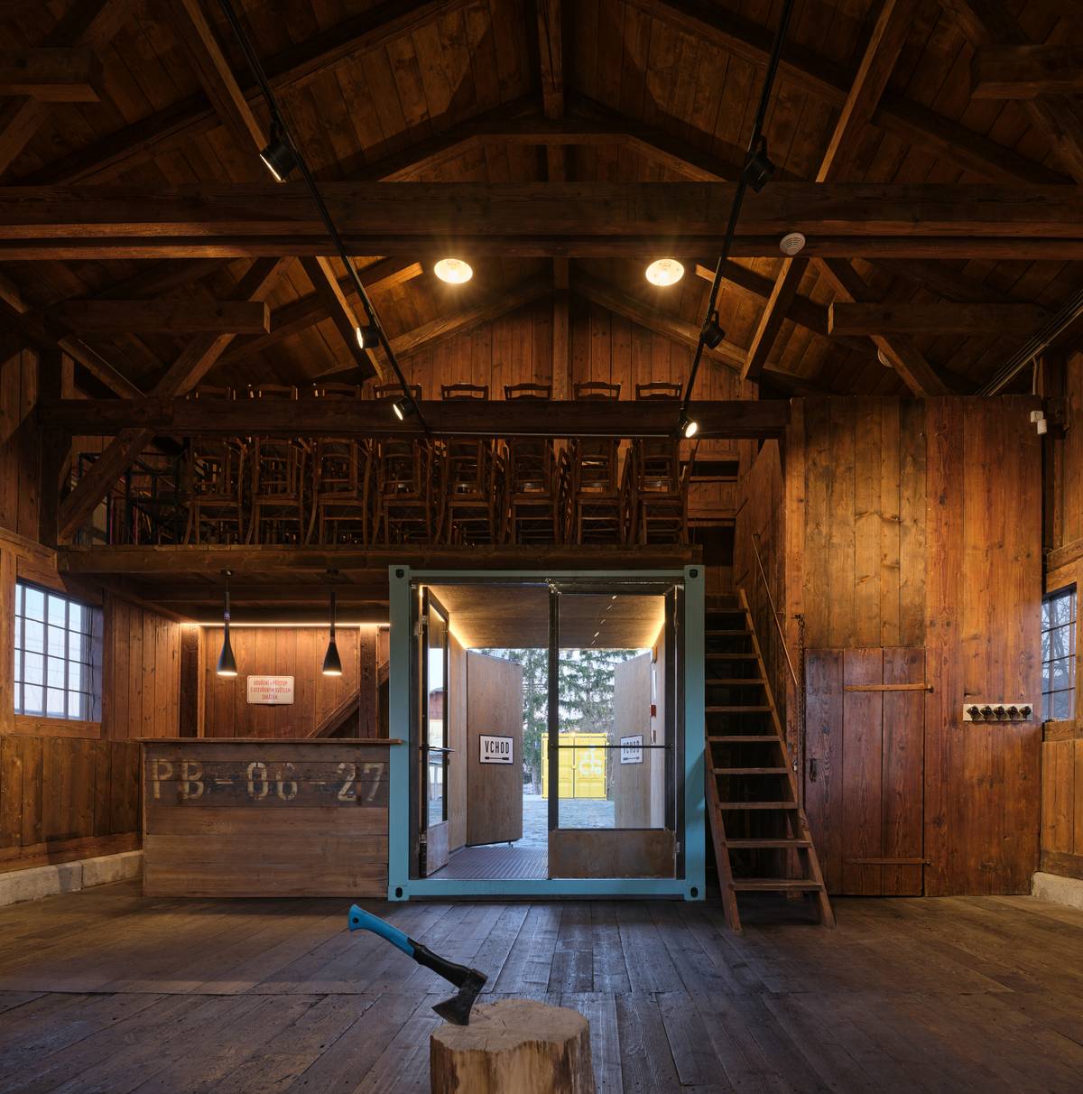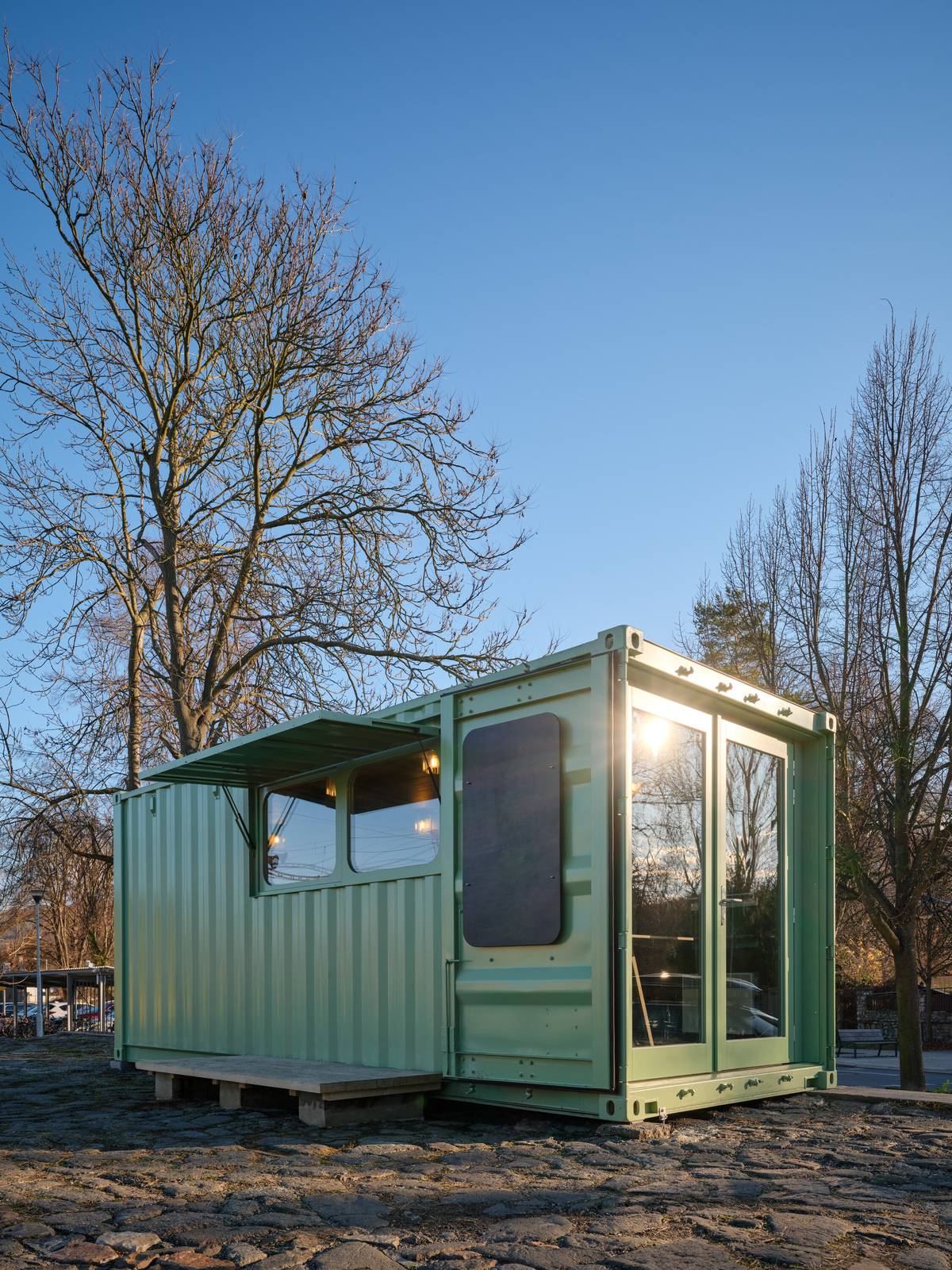 Doprovodné stavby z repasovaných kontejnerů skvěle odpovídají charakteru místa.