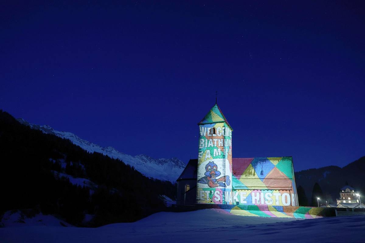 Kostel Sv. Marie a Michaela ve vesnici Churwalden je každý večer nasvícen v barvách biatlonového mistrovství.