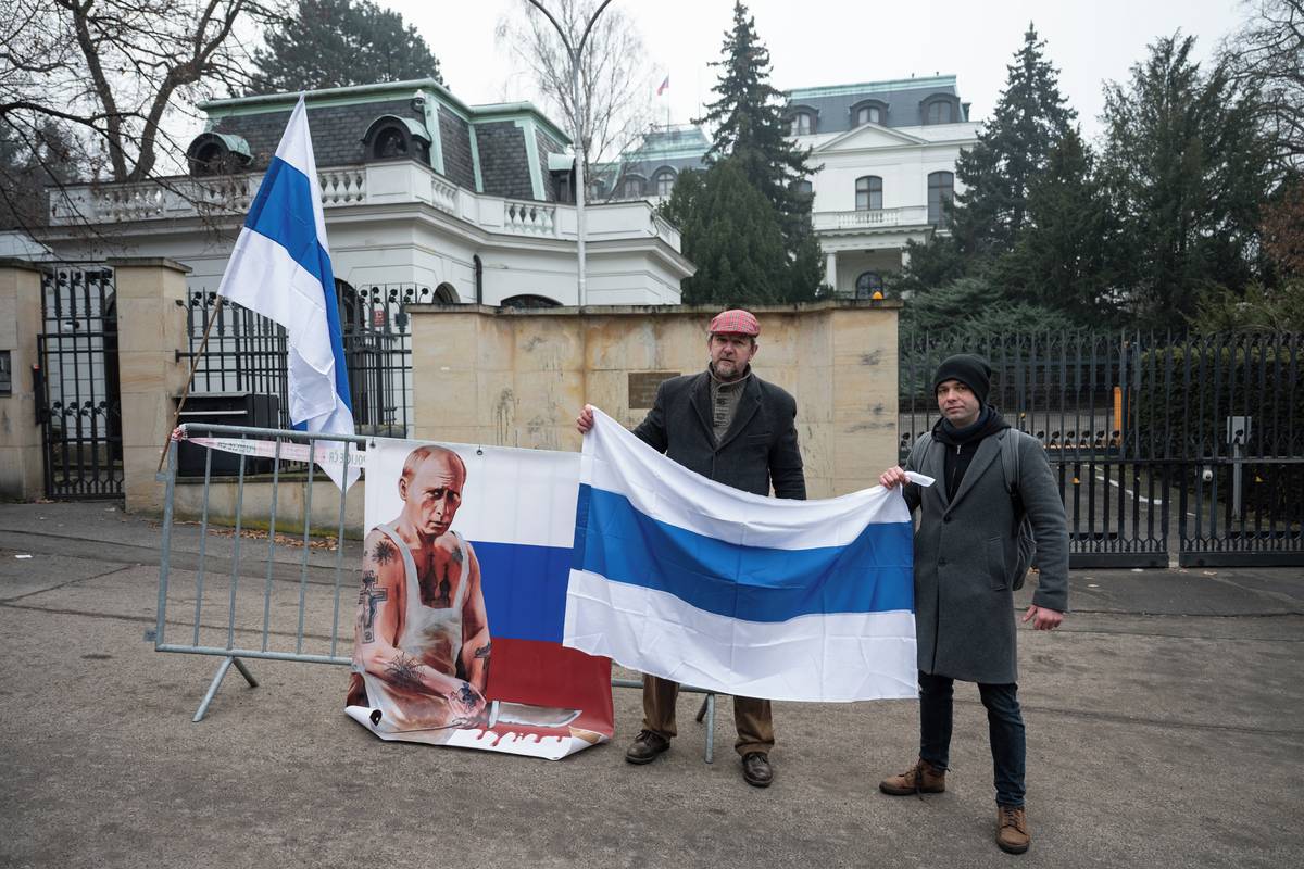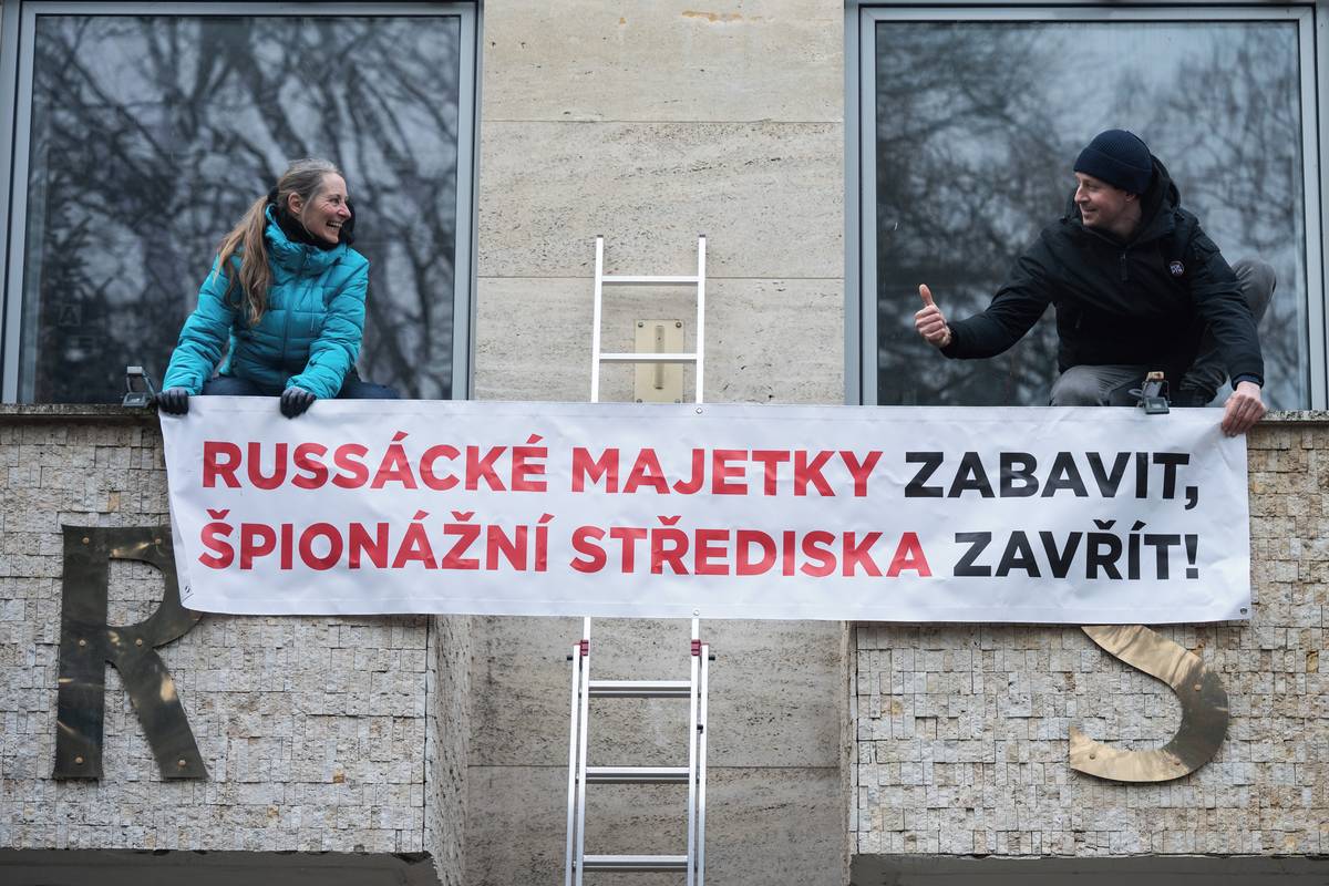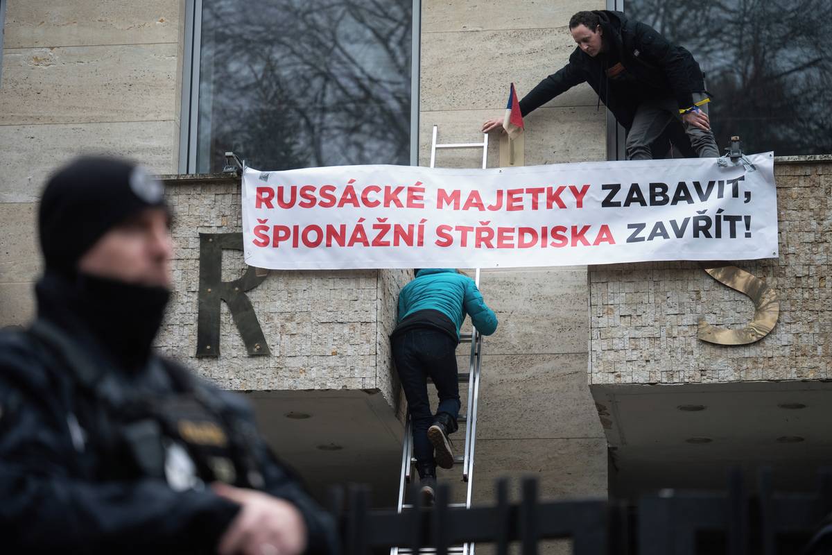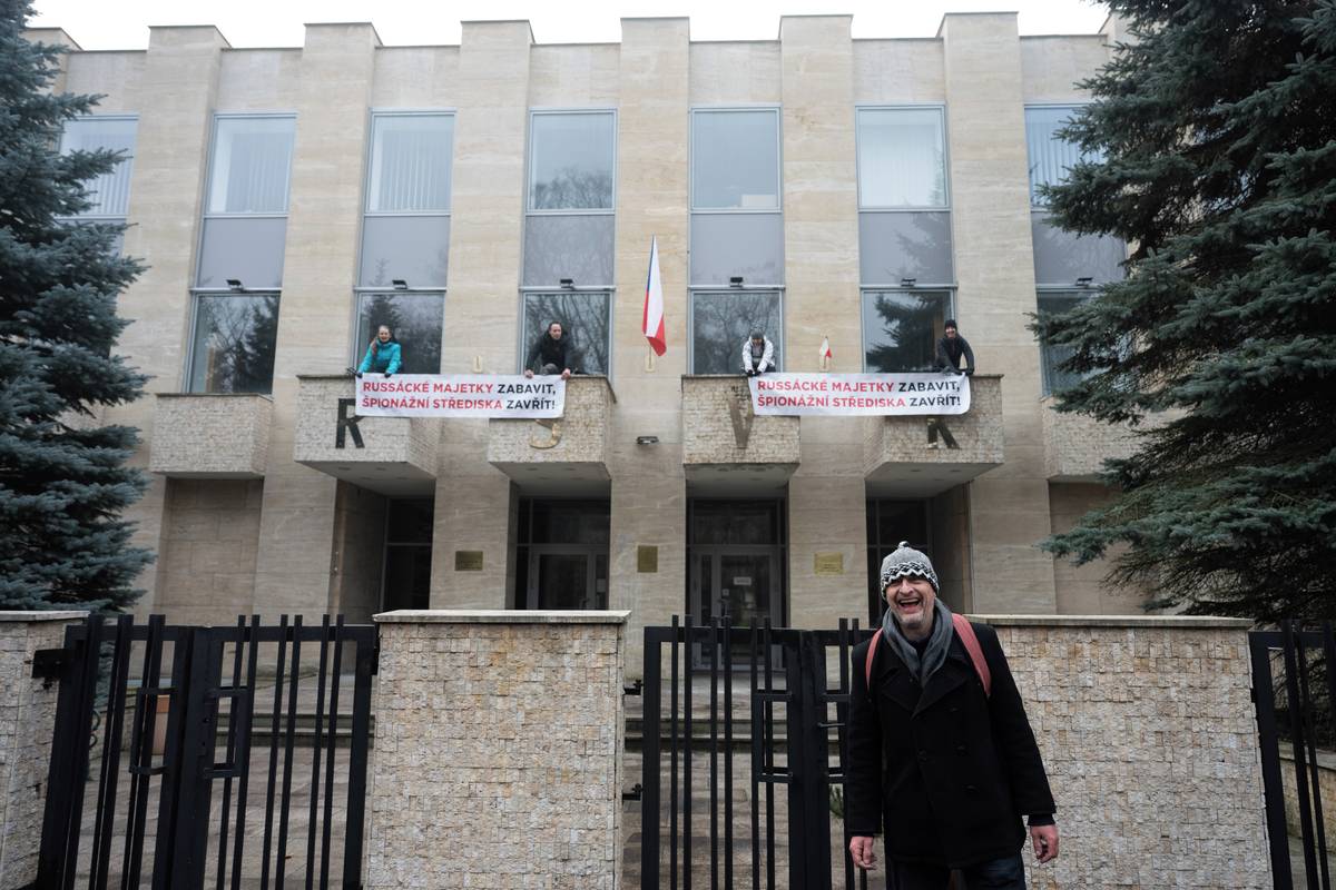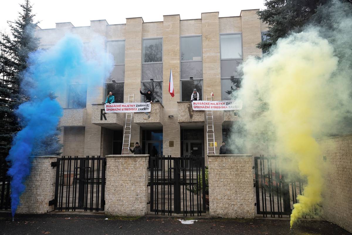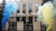 Před budovou odpálili dýmovnice v ukrajinských barvách.