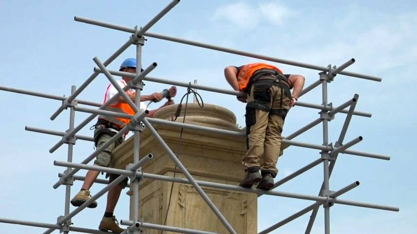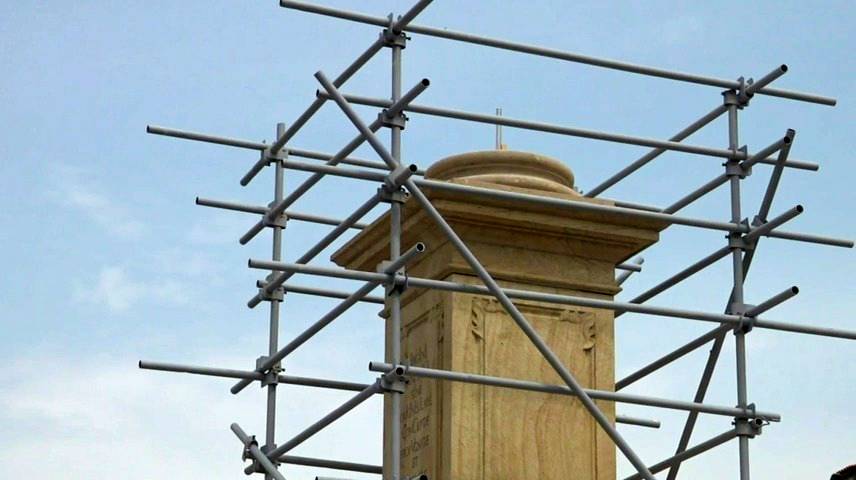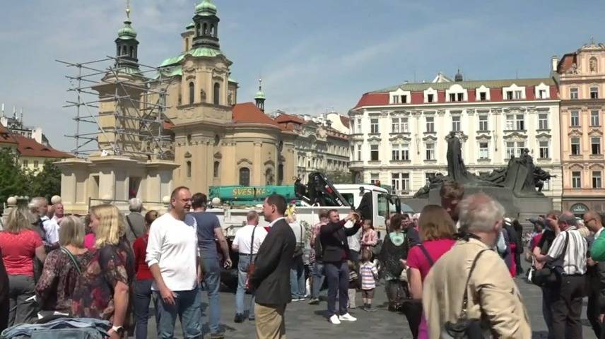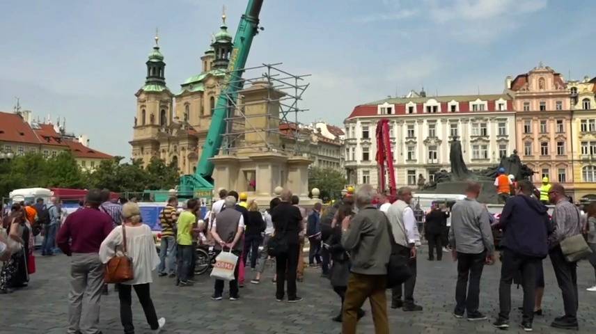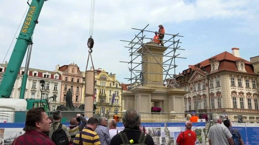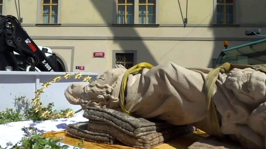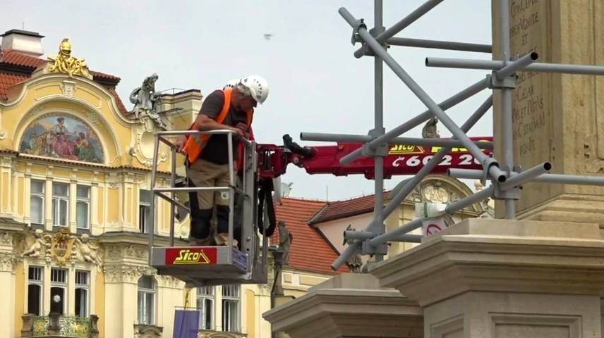 Práce nabraly zpoždění, protože se nedařilo dopravit sochu Panny Marie, která bude na vrcholu sloupu, z podstavce u Týnského chrámu na náměstí.