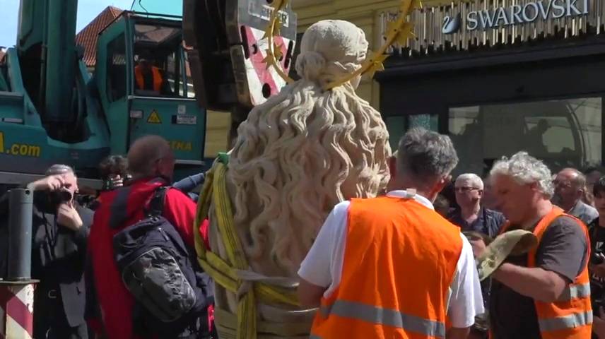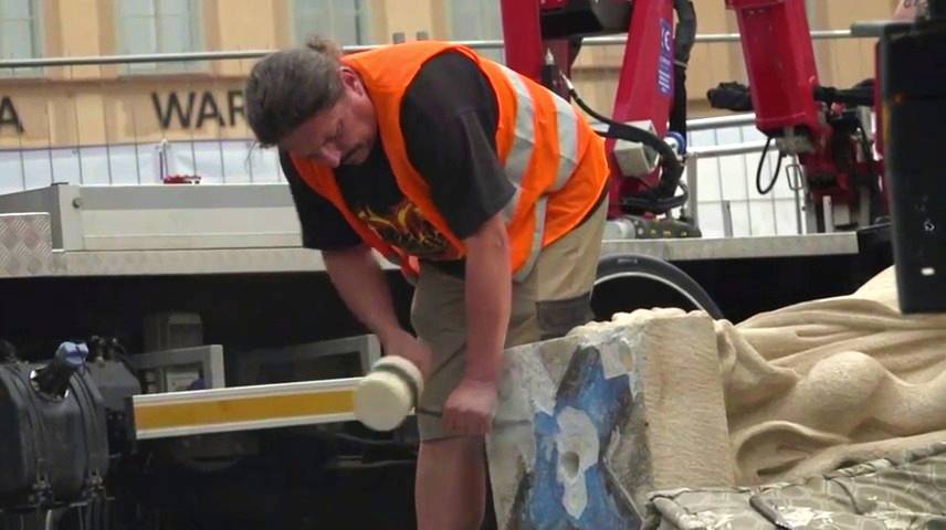 Sochu se podařilo z podstavce sundat před 11:00 a poté ji nákladní auto převezlo na náměstí, následovalo vztyčení sloupu.