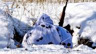 Ukrajinský voják se kryje za autem ve městě Irpiň severozápadně od Kyjeva (13. března 2022).