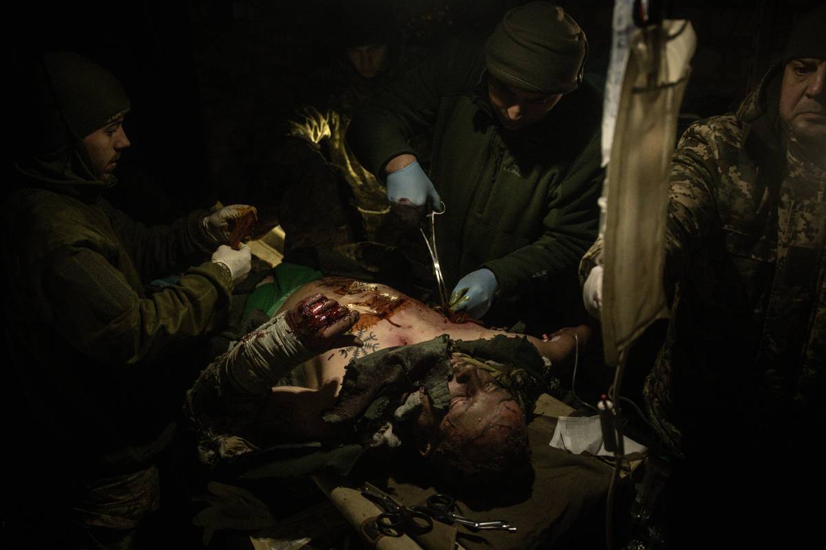 Za nejdelší a jednu z nejkrvavějších je označována bitva o Bachmut, který leží asi 70 kilometrů severně od Doněcka. (Vojenští lékaři ošetřují u Bachmutu příslušníka ukrajinské armády se střepinovým zraněním a popáleninami na těle v polní nemocnici, 5. prosince 2022.)