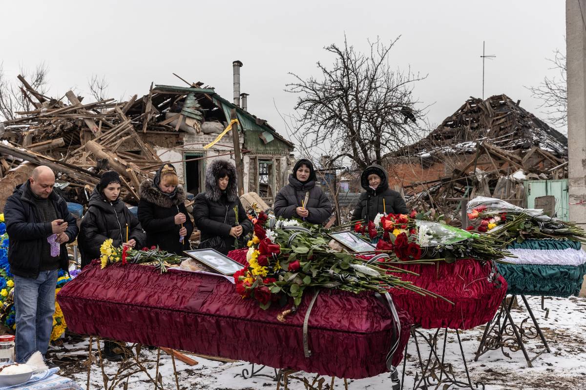 Protiofenziva ale vedla k jen omezeným územním ziskům a iniciativu později převzali Rusové, kteří dobyli několik strategických měst. (Přátelé a rodina se účastní pohřbu tří civilistů zabitých při ruském raketovém útoku, 22. února 2024 v Kramatorsku.)