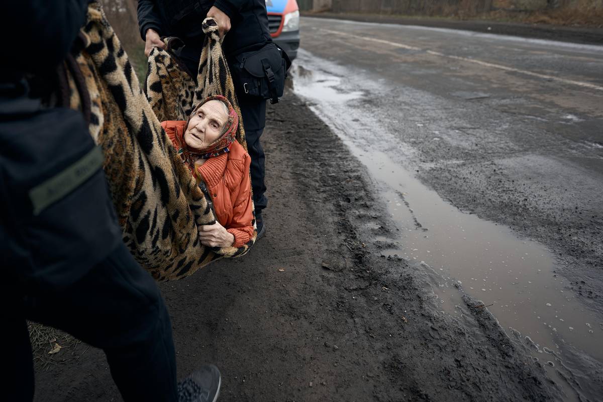 Fotografie ženy, která navždy zůstane jedním ze symbolů prvního dne invaze. Učitelka Olena byla zraněná při ruském ostřelování města Čuhujiv. Tehdy světu došlo, že pod útokem nebudou jen vojenské cíle, ale všichni Ukrajinci. (Vyfoceno 24. února 2022.)