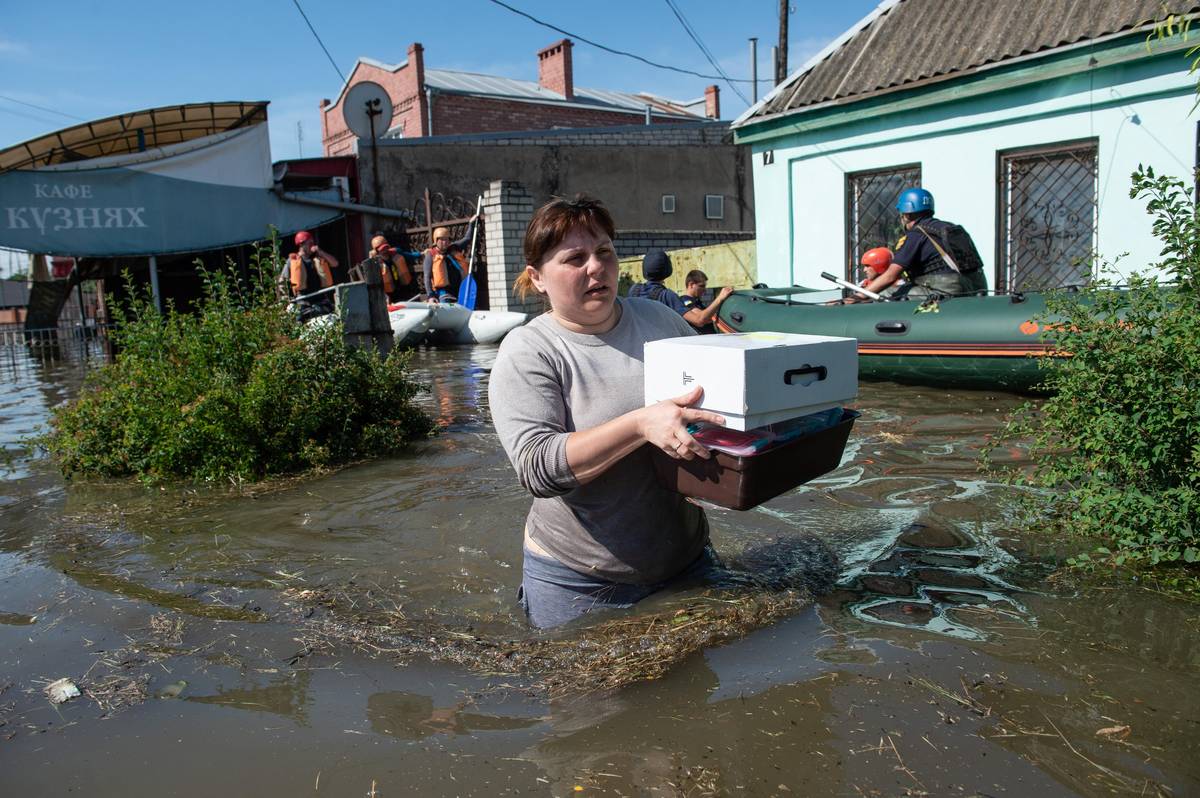 V noci na 6. června 2023 se protrhla Kachovská přehrada, z čehož se vzájemně obvinily Ukrajina i Rusko. Přehrada byla již od prvních dní invaze okupována ruskými silami. Protržení způsobilo rozsáhlé záplavy, jež si vyžádaly desítky obětí na životech na obou březích Dněpru, další lidi připravily o domovy a zničily zemědělskou půdu. Celkem zahynulo dle serveru Meduza 76 lidí, 55 na území okupovaném Ruskem a 21 v oblastech pod kontrolou Ukrajiny. (Žena zachraňuje své věci ze svého domu v Chersonu po protržení přehrady Kachovka, 7. června 2023.)