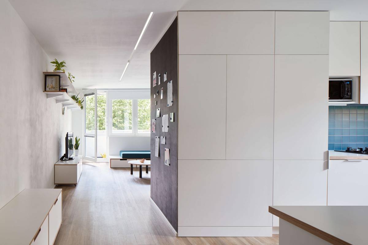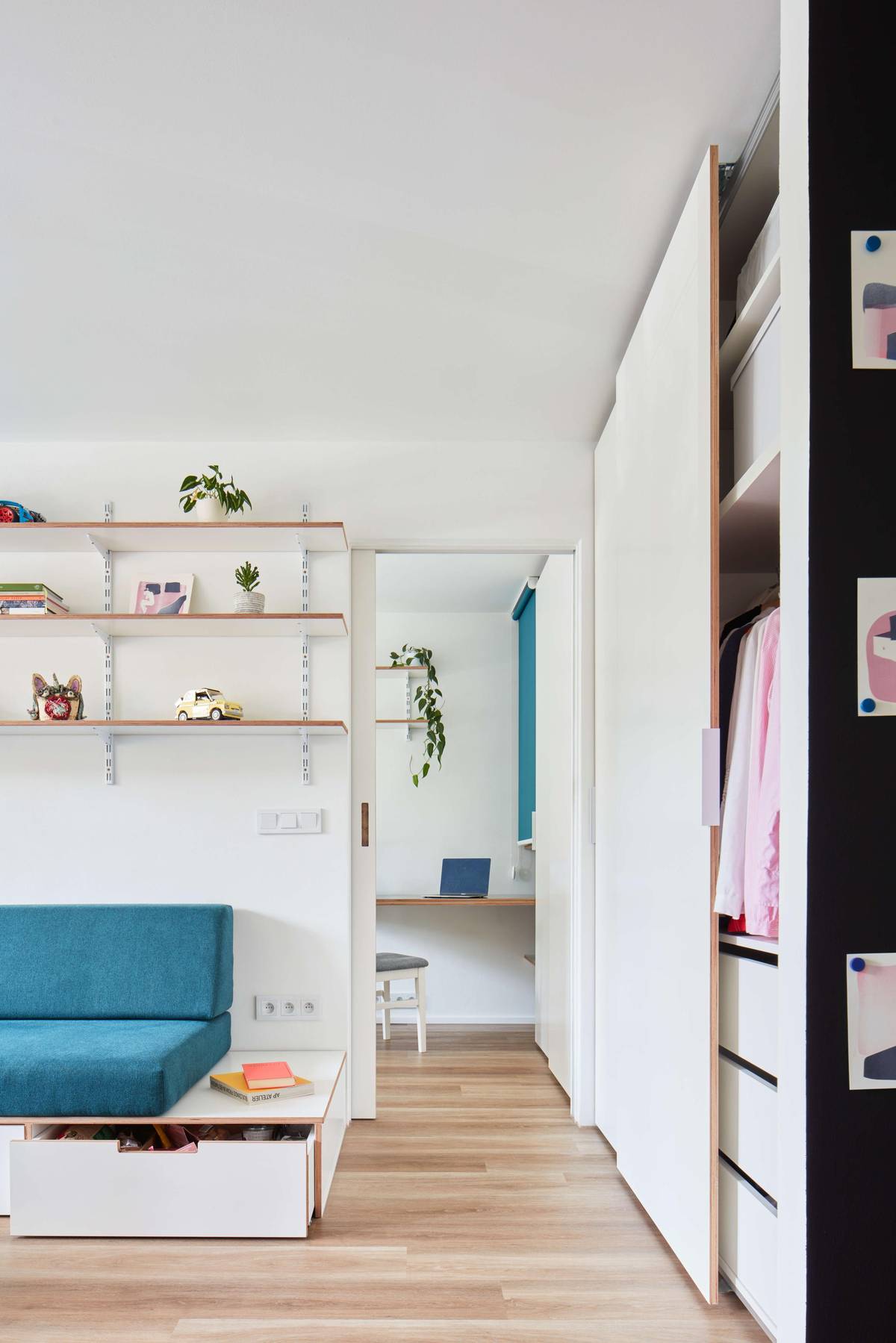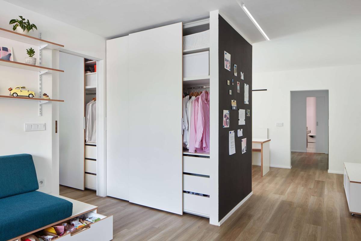Vestavné úložné prostory, posuvné panely a konzolové policové systémy umožňují efektivní organizaci bez zbytečného zahlcení prostoru. Magnetická tabule je středobodem rodinného života.