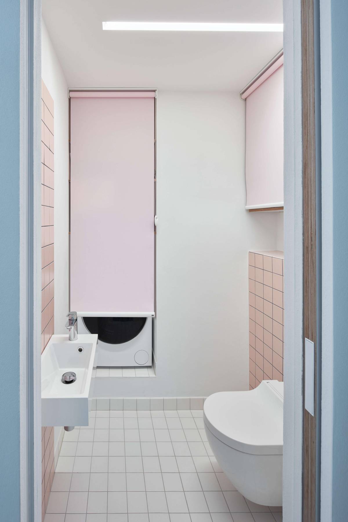 Růžové roletky efektivně řeší úložné potřeby a zakrývají niku s pračkou a sušičkou.
