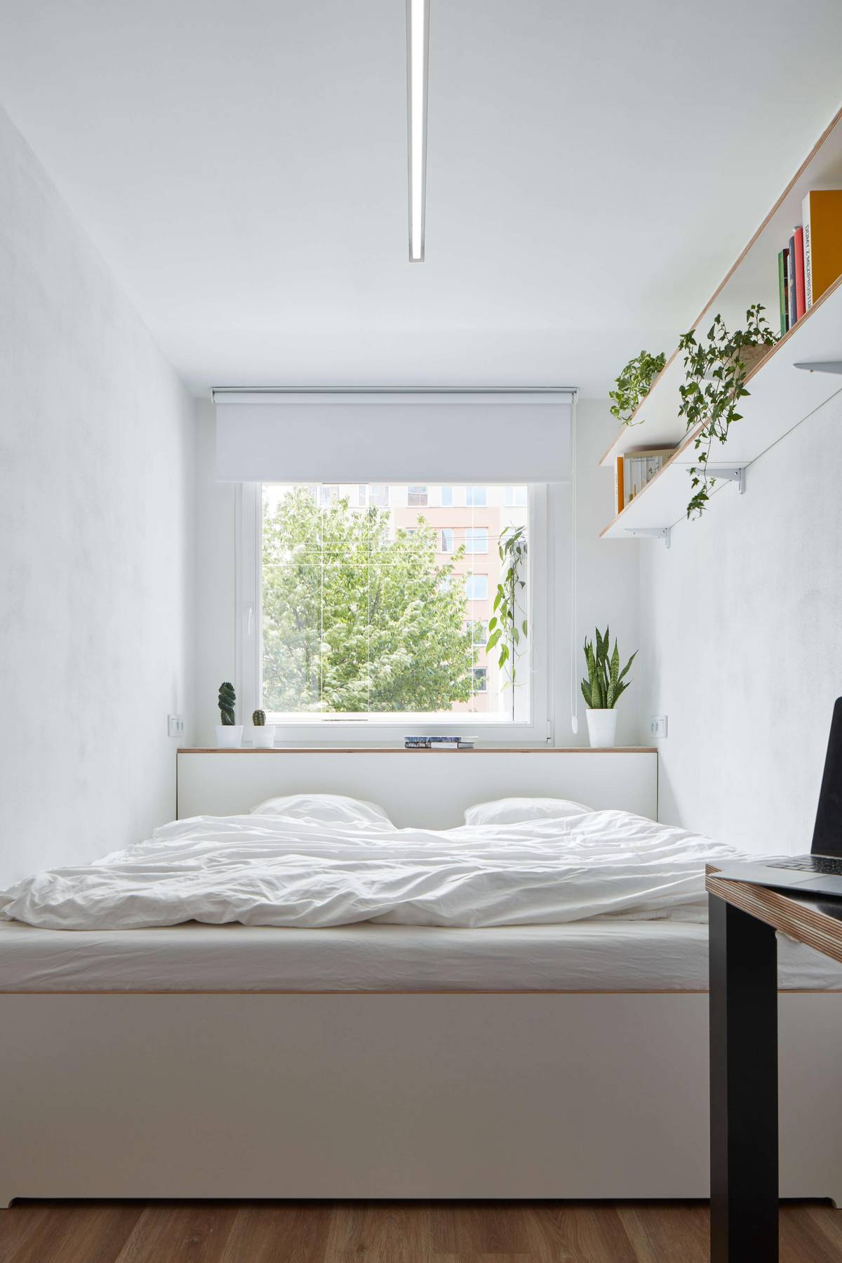 Průhled přes obývací pokoj do ložnice s pracovním koutem