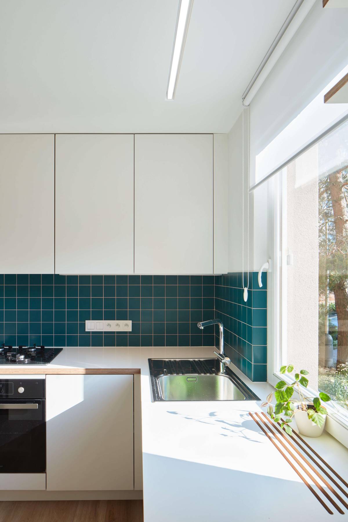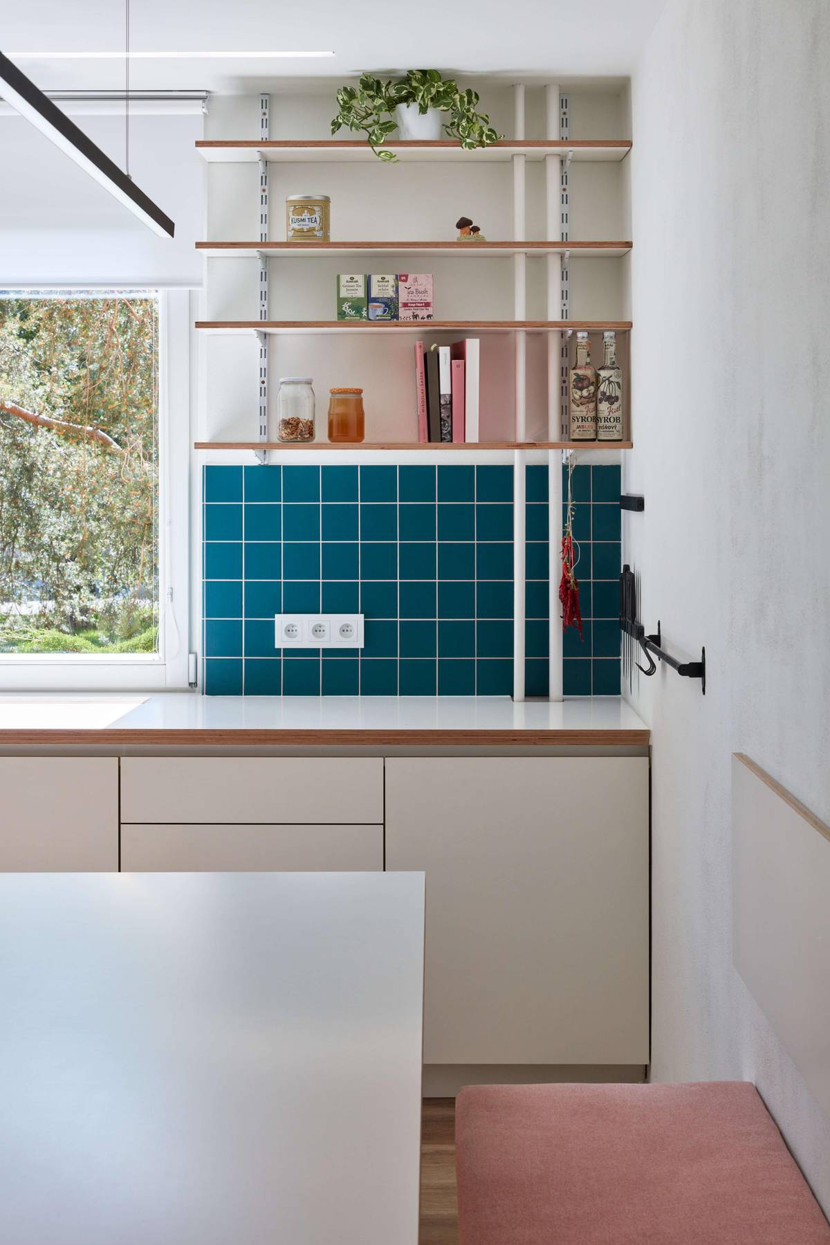 Kuchyni dominují zelené obklady s růžovou spárovačkou. Dřevěné linky březové překližky dodávají prostoru teplo a jemnost.