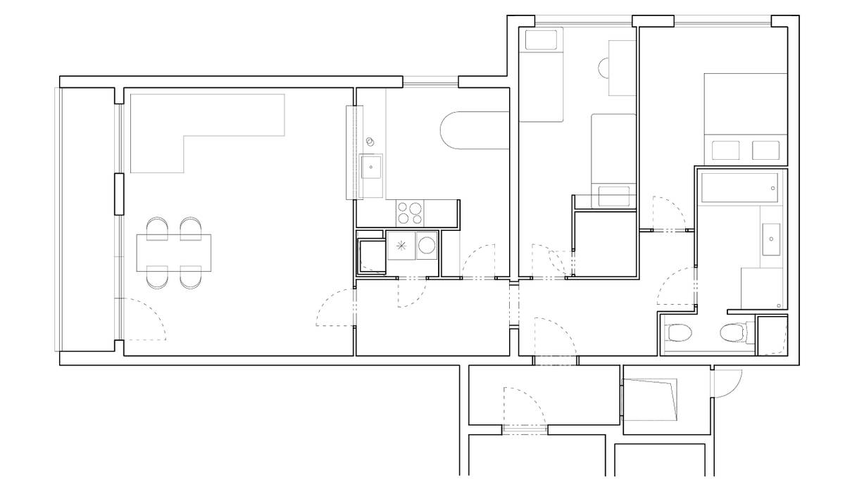 Kuchyň doplňuje jídelní stůl s lavicemi.