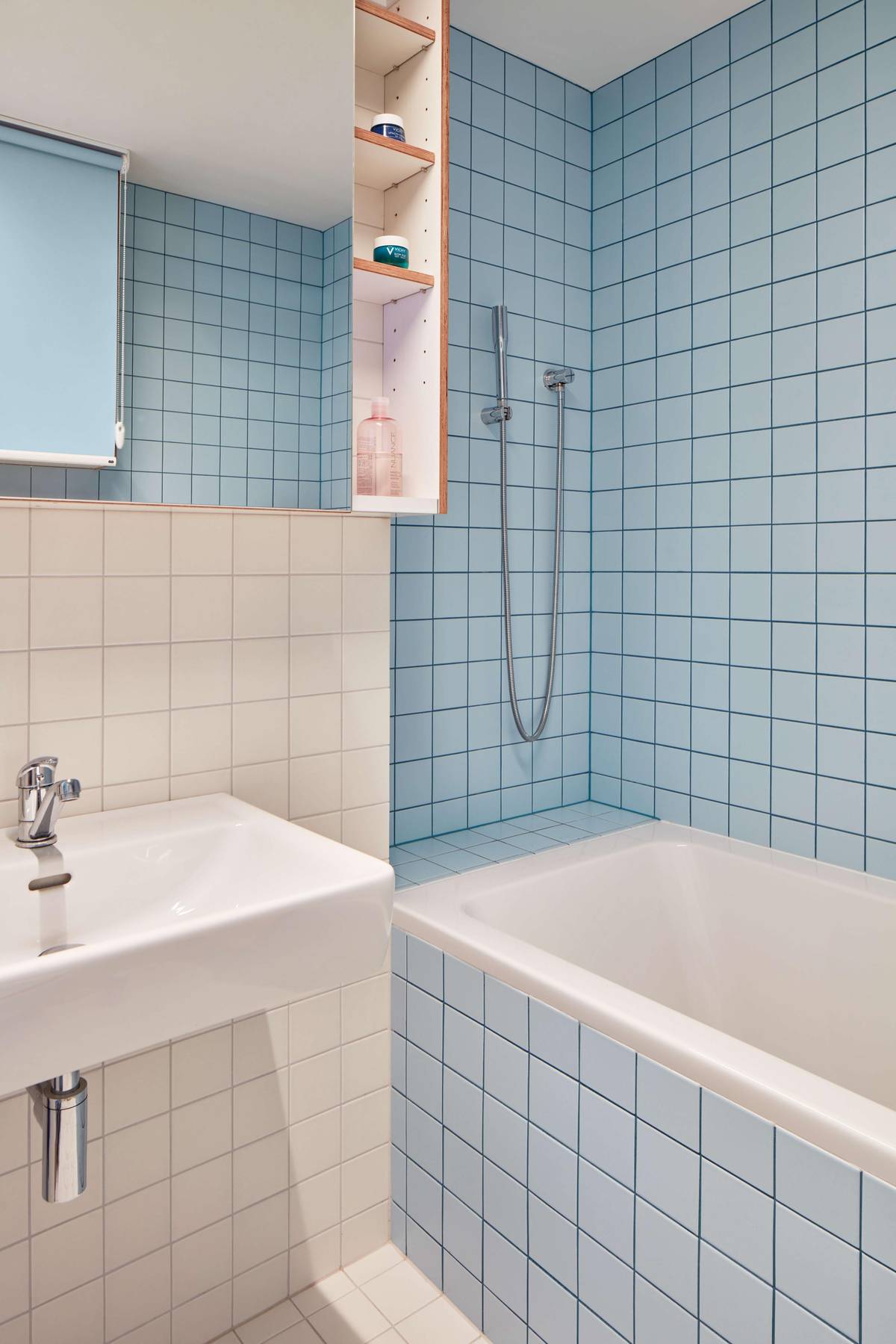Koupelnu charakterizuje modrý obklad se zelenou spárovačkou.