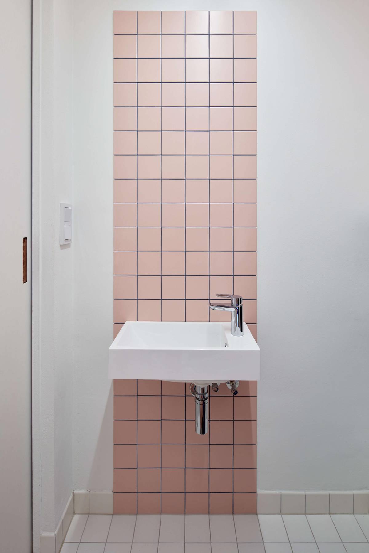 Toaletě dominuje růžový obklad s modrou spárovačkou.
