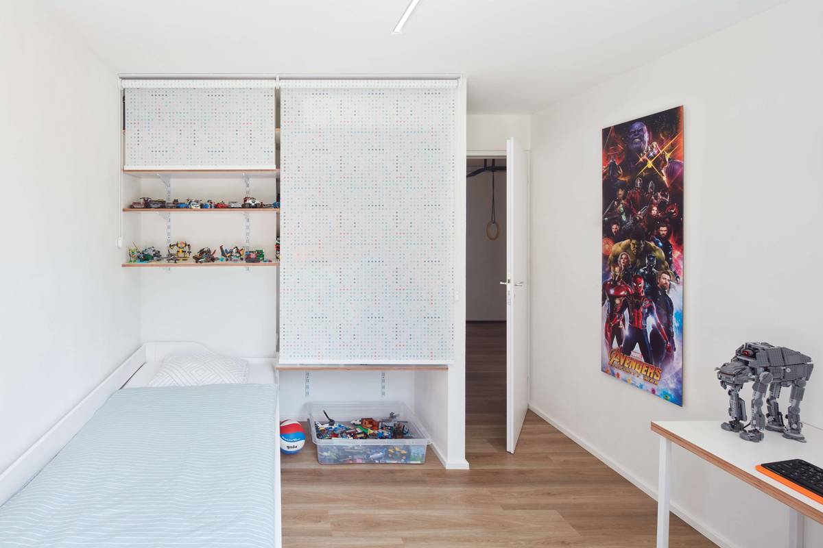 Pokojíček pro syna zdobí pestrobarevné roletky, které zároveň zakrývají úložné prostory.