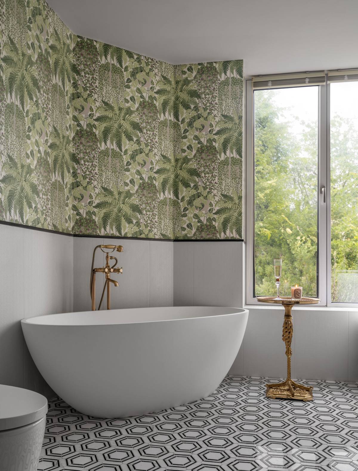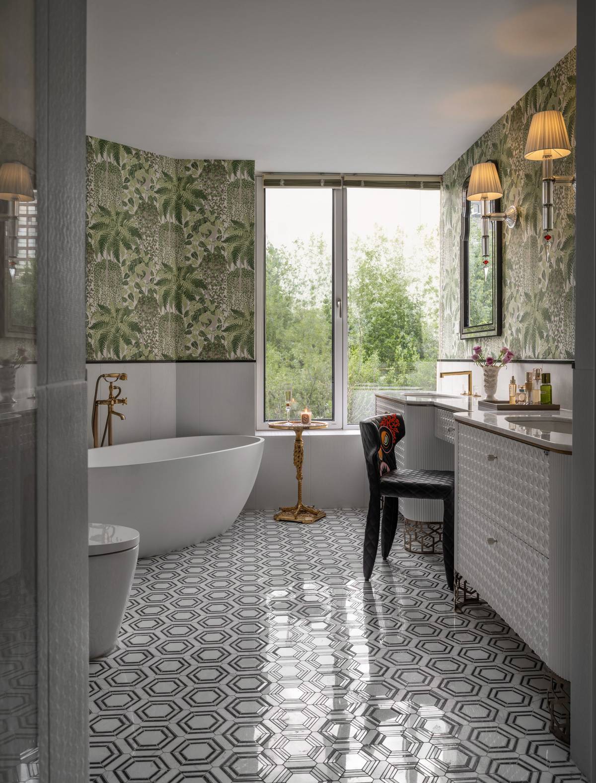 V koupelně zaujme keramická dlažba s hexagonálním vzorem.